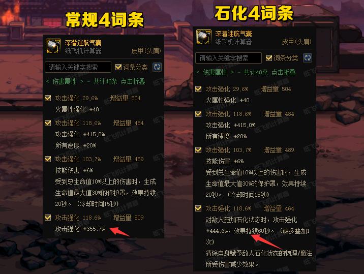 【2】“深潛頭肩”的「連擊攻強 詞條」換成「石化攻強 詞條」,這個詞條比連擊攻強高了0.8%左右,這樣「石化鞋+深潛頭肩」就能媲美「萬念俱灰鞋+深潛頭肩」了。