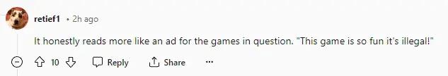 負責爲遊戲大廠辯護的律師團隊發佈了一篇駁回動議,其中辯稱道,遊戲“太過有趣”(too entertaining),並非限制遊戲出版和言論自由的正當理由。
