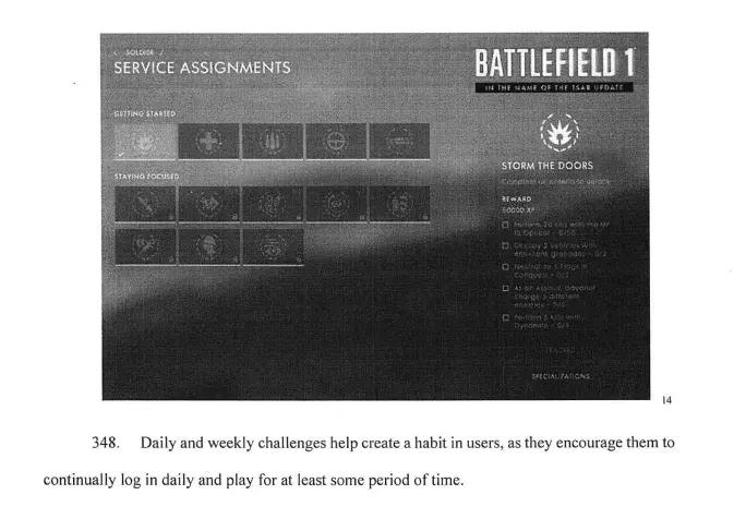 訴狀用了很多篇幅來概括每款遊戲“令人上癮”的特性。其中不乏部分令玩家羣體產生反感乃至深惡痛絕的設計,例如“掠奪性貨幣化”的微交易政策、開箱和通行證制度、“氪金致勝”(P2W,Pay-to-Win)的理念,以及現代互聯網常見的、帶有欺騙性的UI設計。