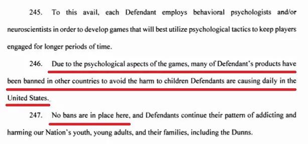 “由於遊戲對心理方面的影響,來自被告的許多遊戲已在其他國家被禁止,以避免類似於被告每天都在對美國的兒童所造成的傷害。但在美國,沒有任何禁令……”