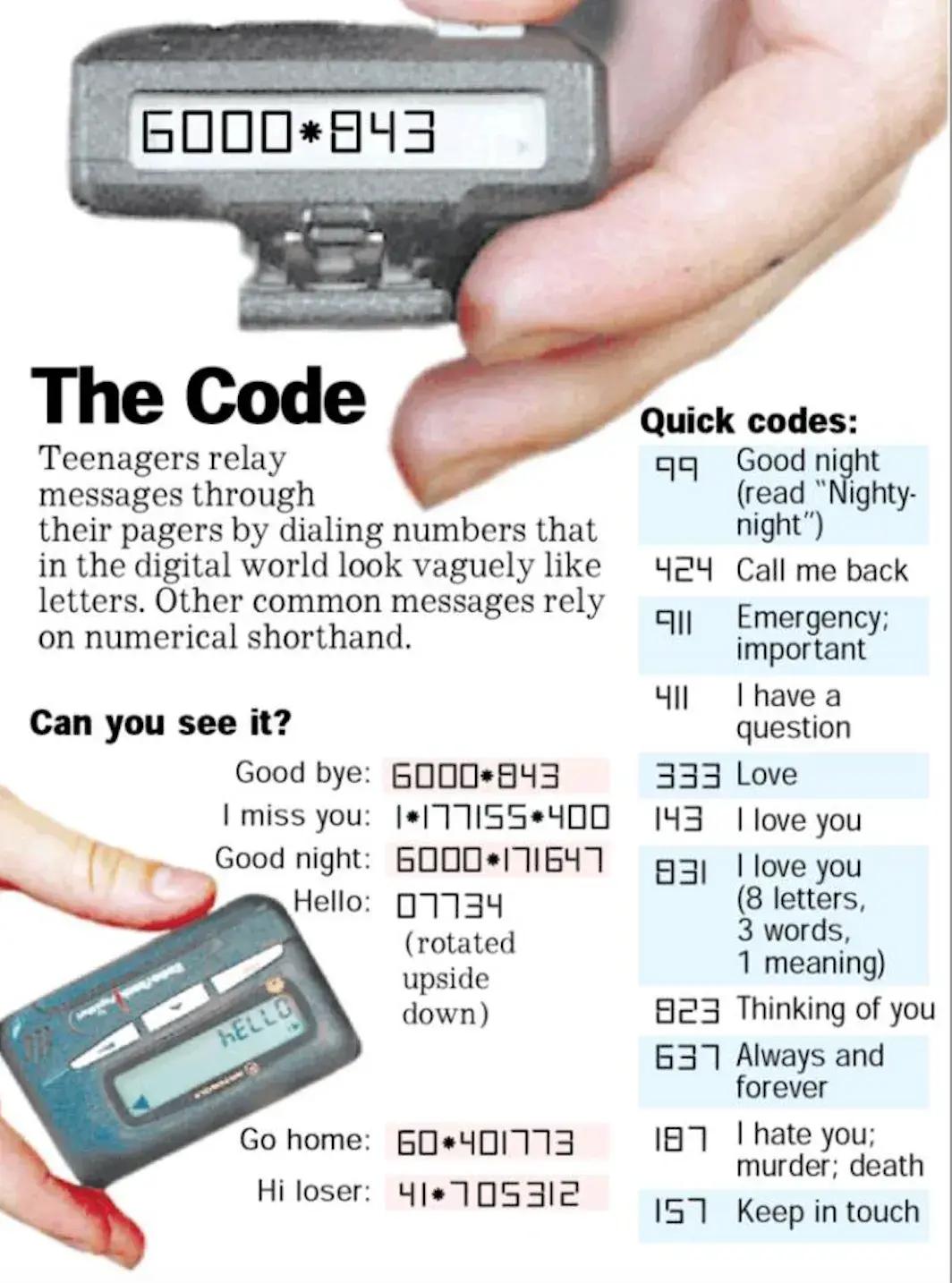 傳呼機的體積,最大不超過一個煙盒。它們通過響鈴和震動,提示主人此刻正在被世界某個角落的人所需要,還能通過屏幕呈現數字符號和文字簡訊。