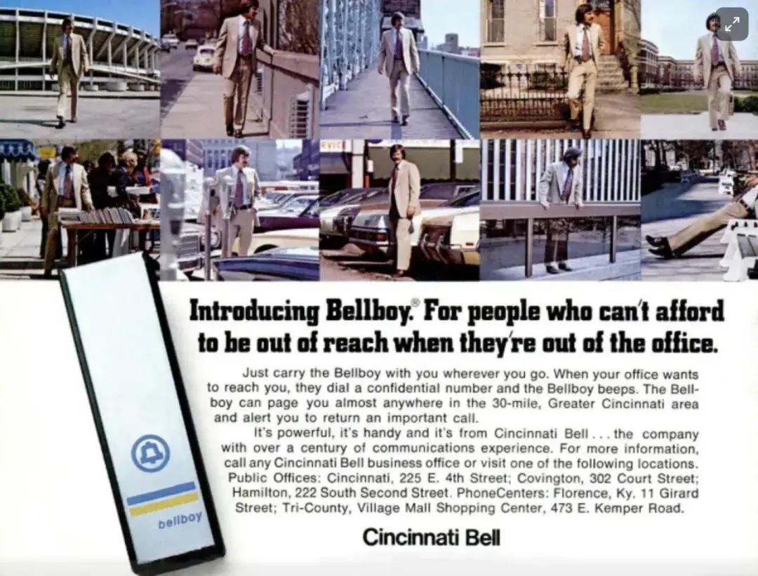 第一臺消費型尋呼機Bellboy的雜誌廣告,突出強調它廣泛的應用場景