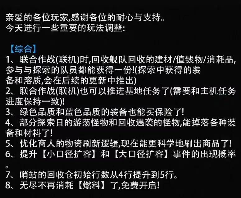 例如,玩家角色的耐力和回收倉容量得到了整體提升,省下了部分搬運物資的時間;“掃蕩”模式不再需要提前攻略地圖,初見就能使用;無盡模式不再需要燃料作爲門票等等。