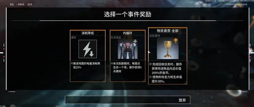 完成某個區域的探索,或者在探索時找到終端機,即可獲得各種有利於作戰,但僅限本次執勤中生效的“事件”,比如免費的炮塔、電力消費降低、建材收入提升、哨站部件加成,或者以強化敵人戰鬥力爲代價,獲取更多戰利品獎勵的“風險事件”。