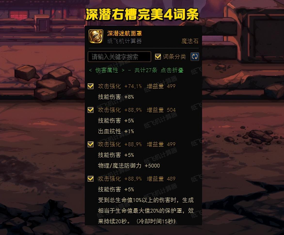然後是“5技攻/5000防禦”,這個是直傷4技攻改版而來的,屬於特殊部位的通用詞條,因此特殊3件套都可以選上這個詞條,這樣就多了1.5W防禦力,四捨五入等於生存能力大幅度提升!