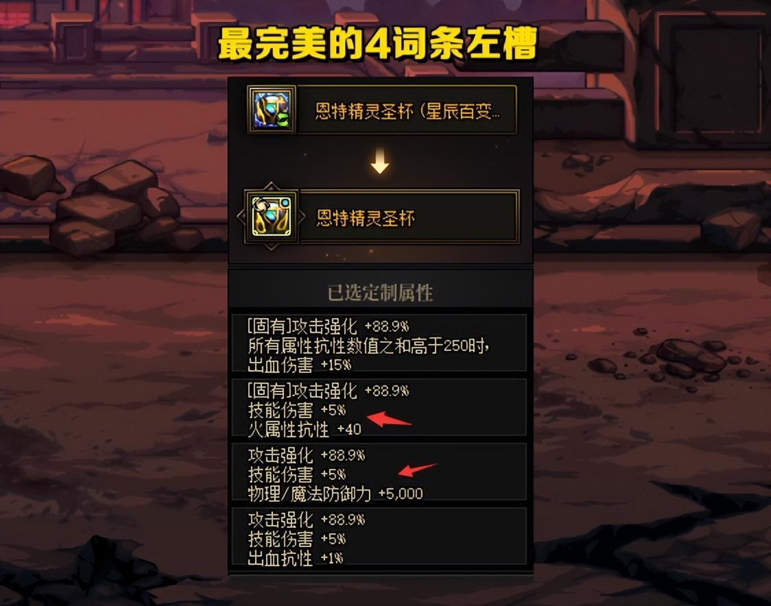 總的來說,“左槽”推薦15出血傷害+任意3個5技攻,如果條件允許,建議加上40火抗和5000防禦力;