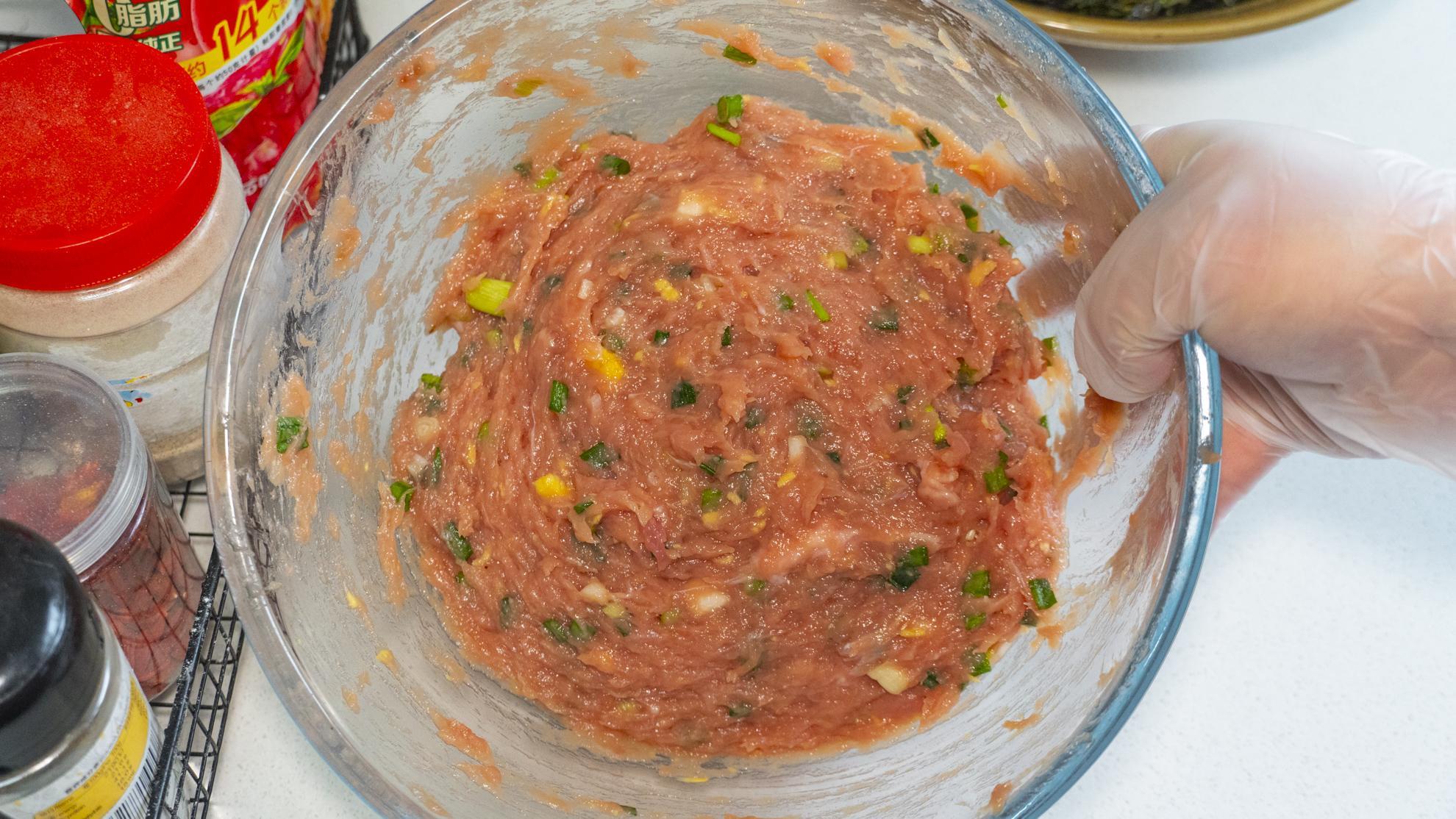 5、最後把紫菜加進來,抓拌均勻,餡兒就調好了,很簡單的。
