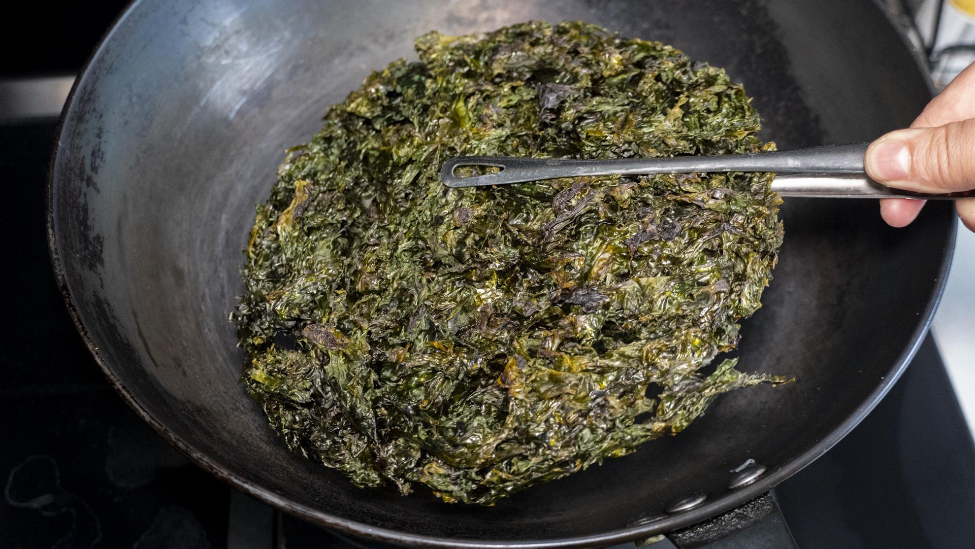 2、就是最小火給它煎一煎,煎到這種綠色就很酥了。