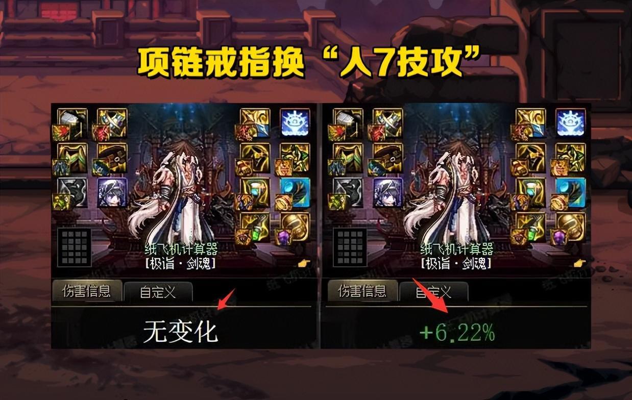 而且之前的“龍7”有所不同,“人7”是首飾部位通用詞條,替換詞條是20單屬強,一個“人7”相對提升就在3%左右,只需要換項鍊和戒指部位的“人7”,就可以帶來6%以上的提升!