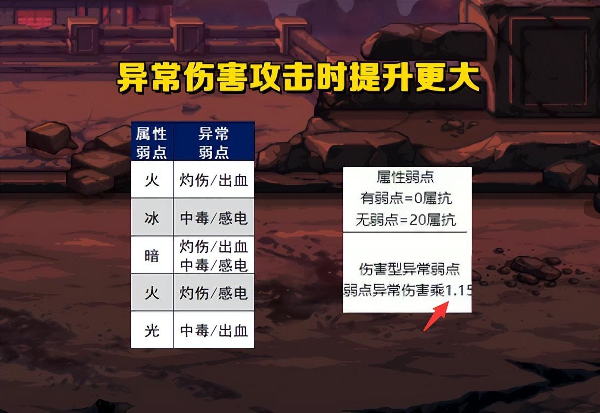 “異常弱點”就很值得一提了,其中有3個BOSS“弱出血”、3個BOSS“弱感電”、3個BOSS“弱灼傷”,分散很均衡,換一句話說就是:只要你走了“異常流”,那麼相對提升就更大!