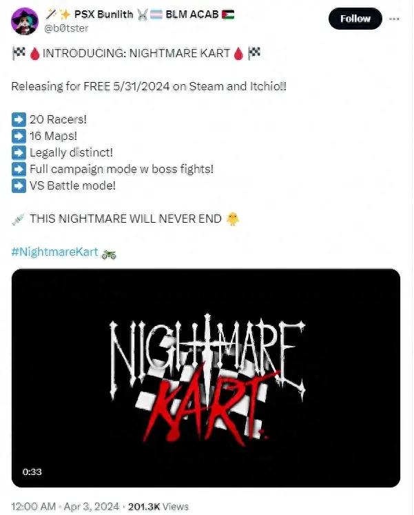 好在被玩家調侃“不到快破產堅決不掏出《血源詛咒》續作”的索尼,倒也沒真的叫停這個遊戲,最近, Lilith Walther 在社交媒體上公佈了這款遊戲的新名稱:《噩夢卡丁車》(Nightmare Kart)。