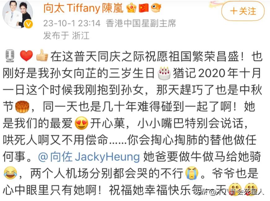 向芷3歲生日的時候,向太發文誇讚孫女是“開心果”,讓人心甘情願爲她做任何事,還說向佐應該“做牛做馬”爲女兒付出。