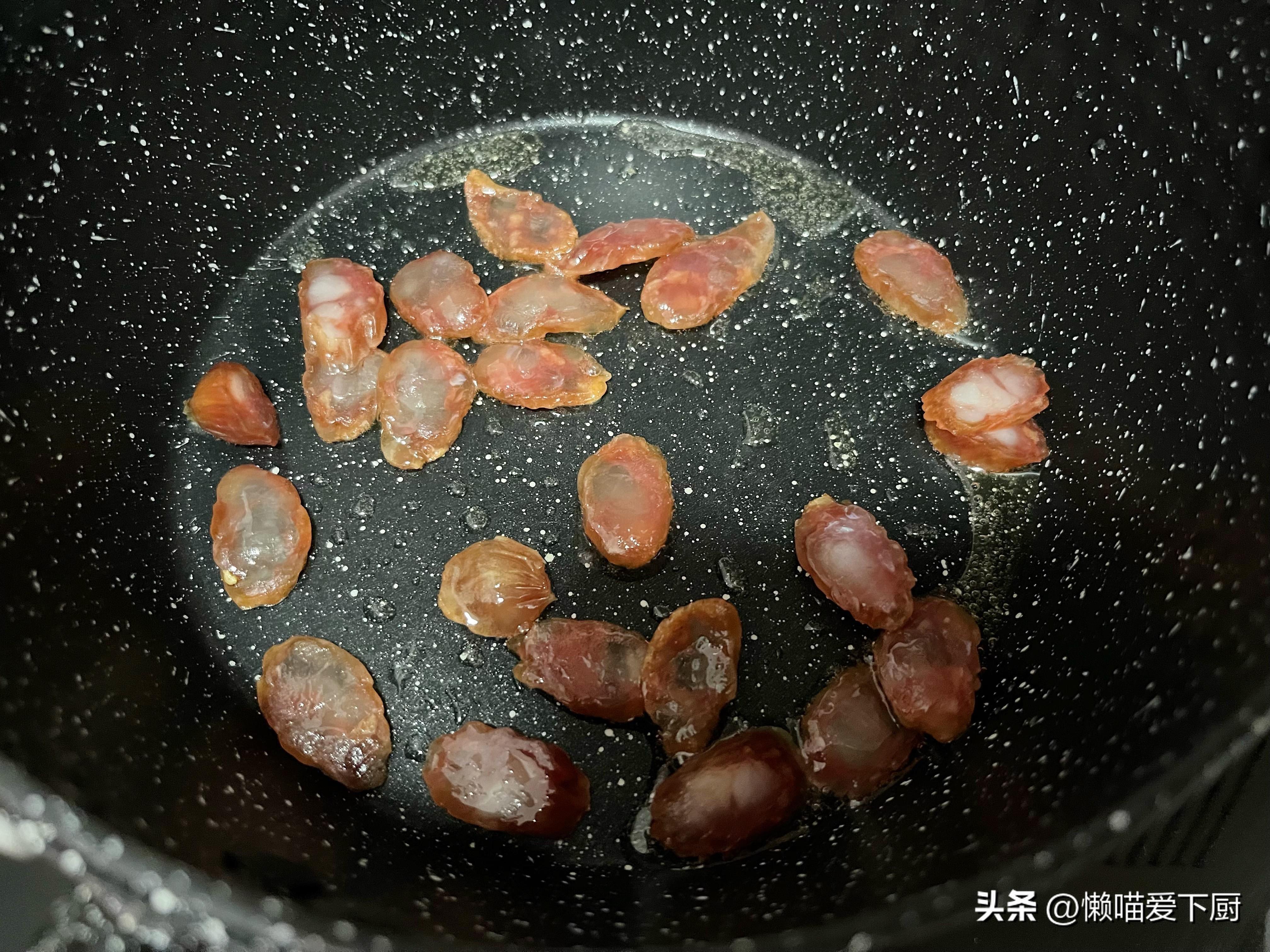 2、鍋中加油,先下臘腸,小火煸炒出油脂;