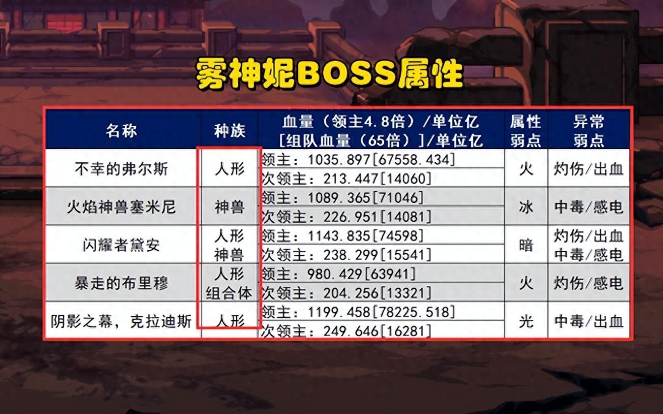 首先看一下“霧神妮”的BOSS屬性分佈,總共有5個BOSS,每週會隨機上線其中3個;