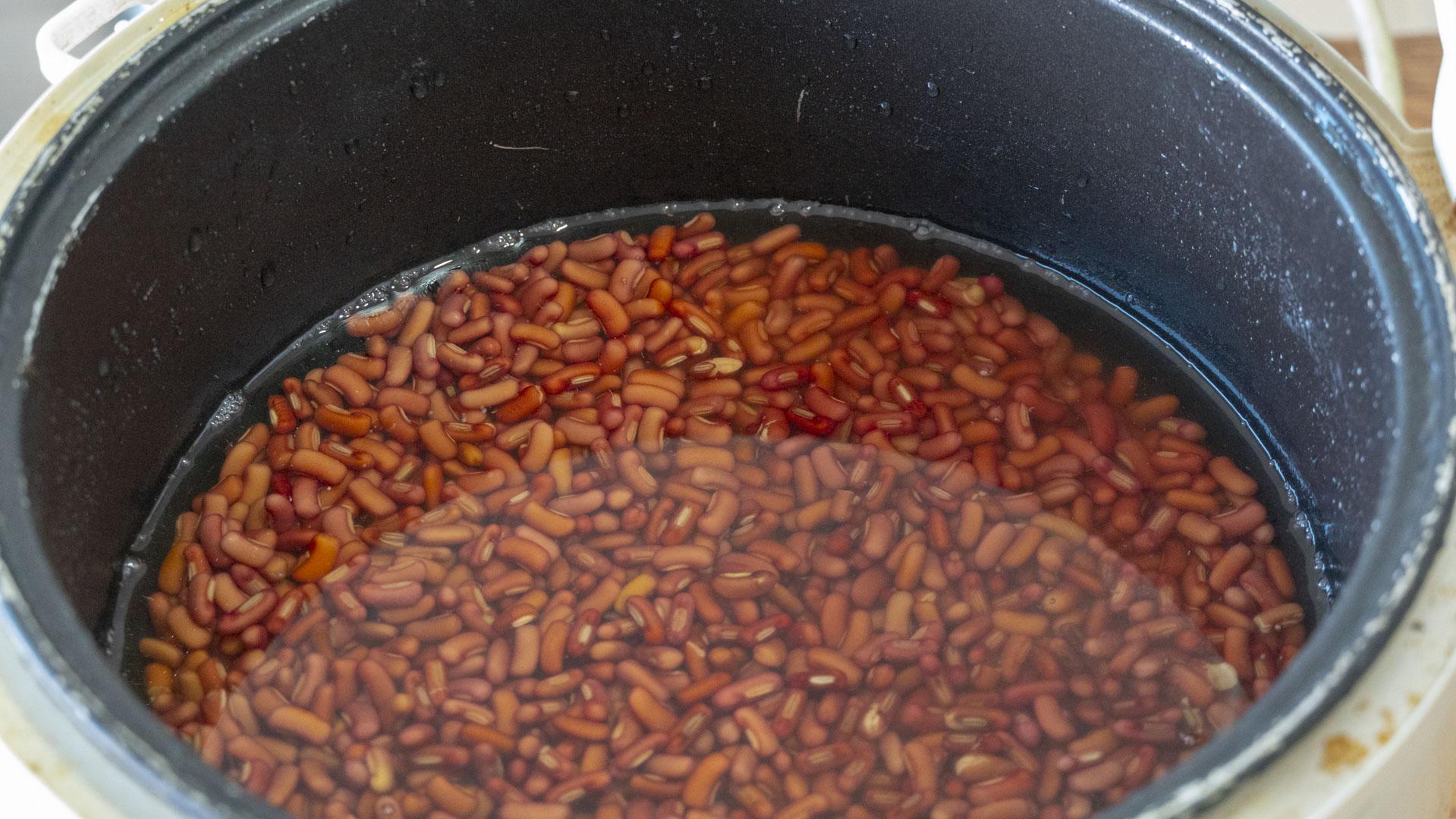 2、400紅豆 ,加清水泡一個晚上,瀝乾水分後倒入電飯鍋裏,加一碗清水末過紅豆後按下煮飯鍵。