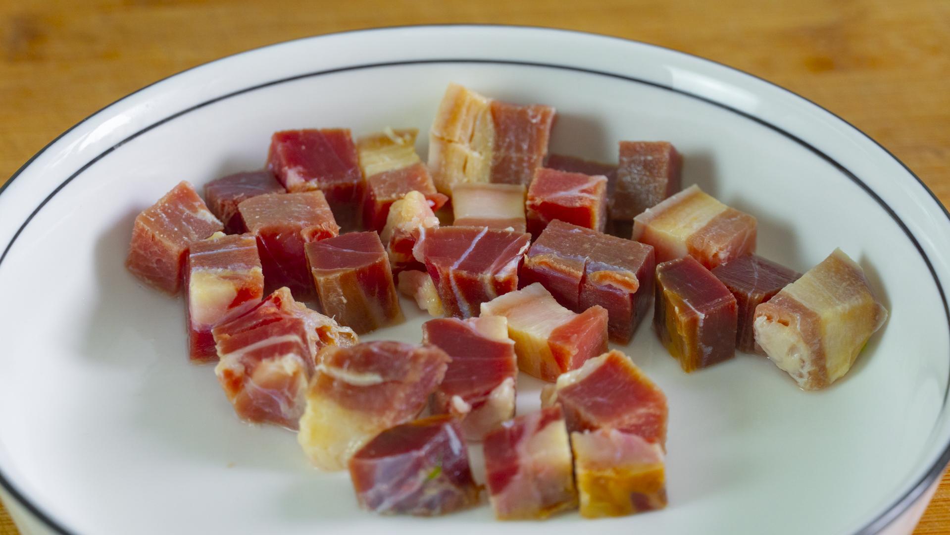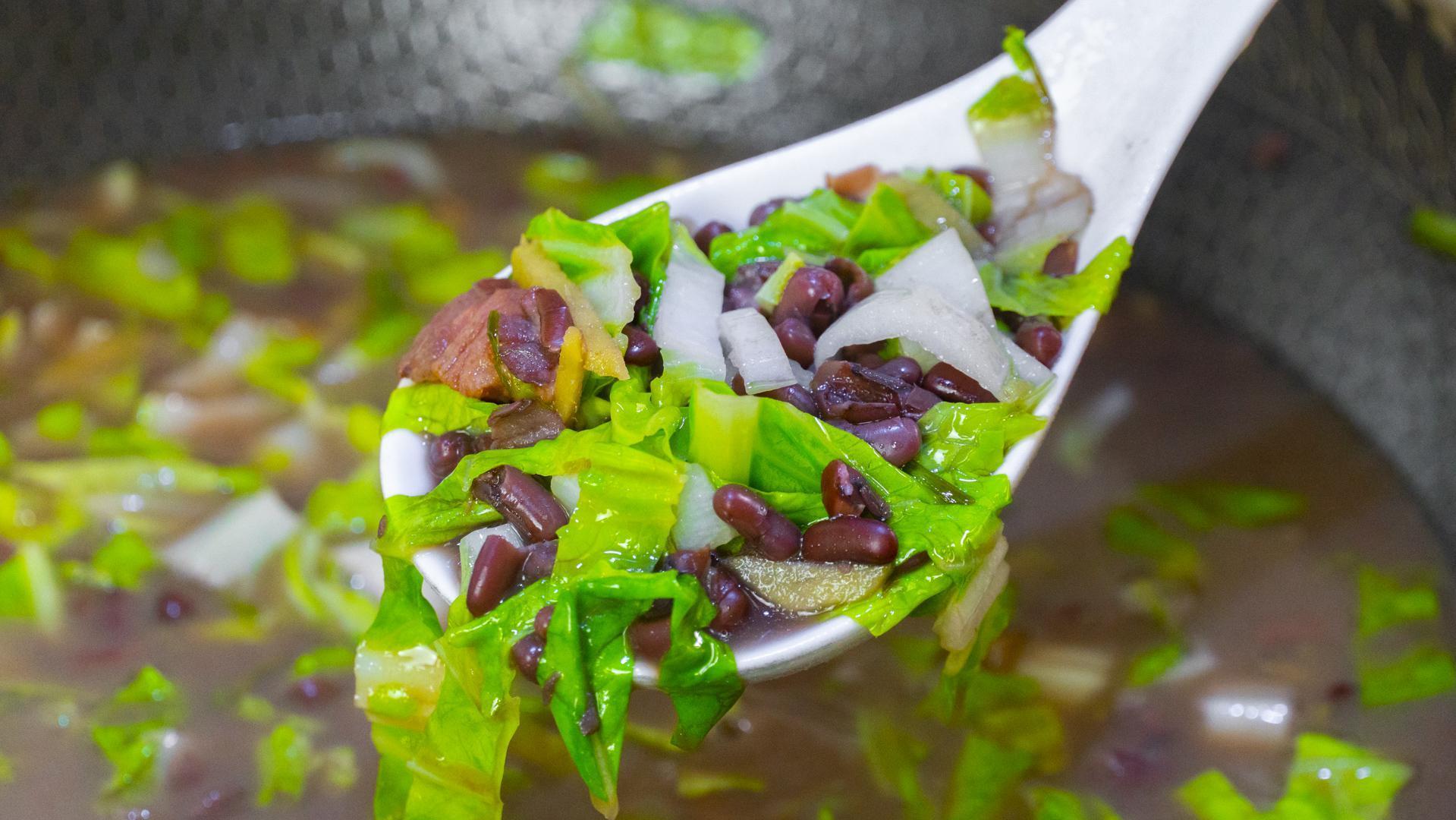 6、起鍋熱油,下火腿炒香,接着把蔥薑蒜也加進來大火爆香。倒入煮好的紅豆,湯也一起倒進來,調味加一勺鹽,一點點的雞精,一勺生抽,接着大火煮開。