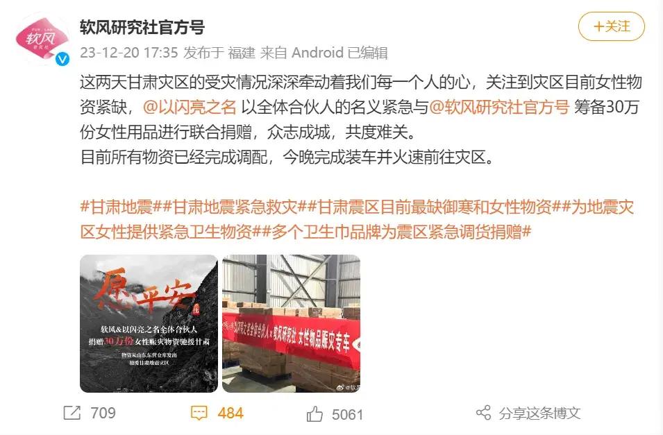 甘肅地震,遊戲以“全體合夥人”的名義向災區捐贈了30萬份女性用品。