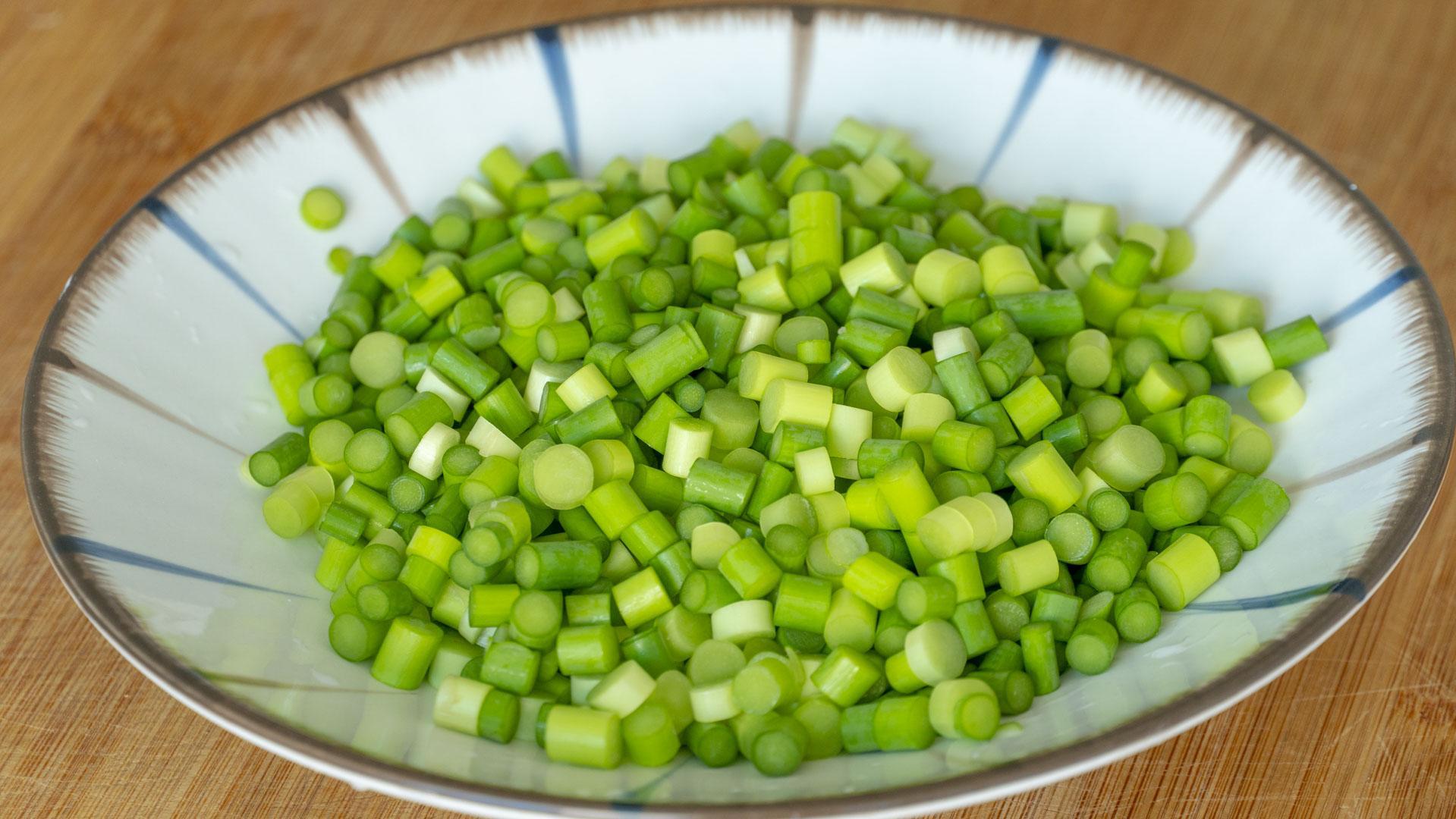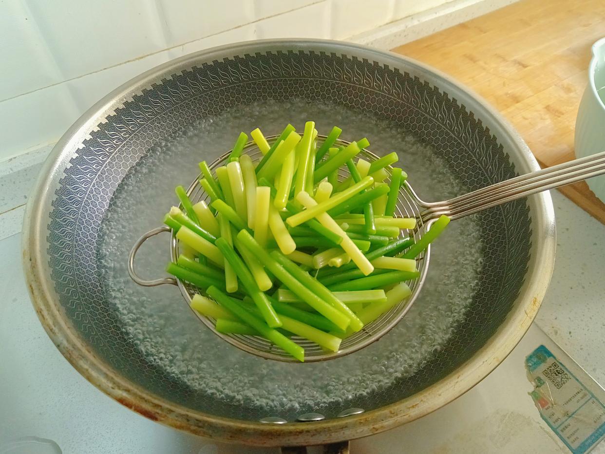 2、鍋裏燒水,水開放入鹽和油,將蒜薹焯水半分鐘,撈出過涼水。