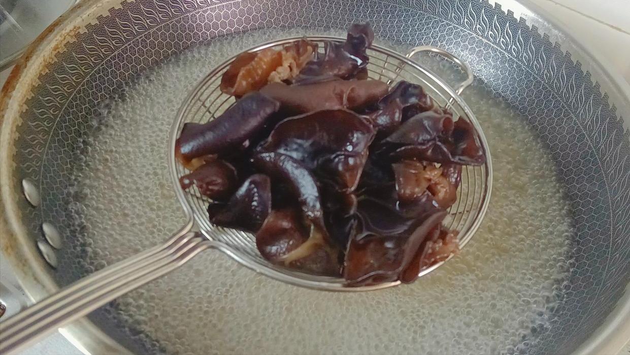 1、木耳10克,加一勺麪粉和清水泡發,起鍋燒水,水開倒入木耳,大火煮3分鐘就夠了,煮熟後撈出來先放一旁。