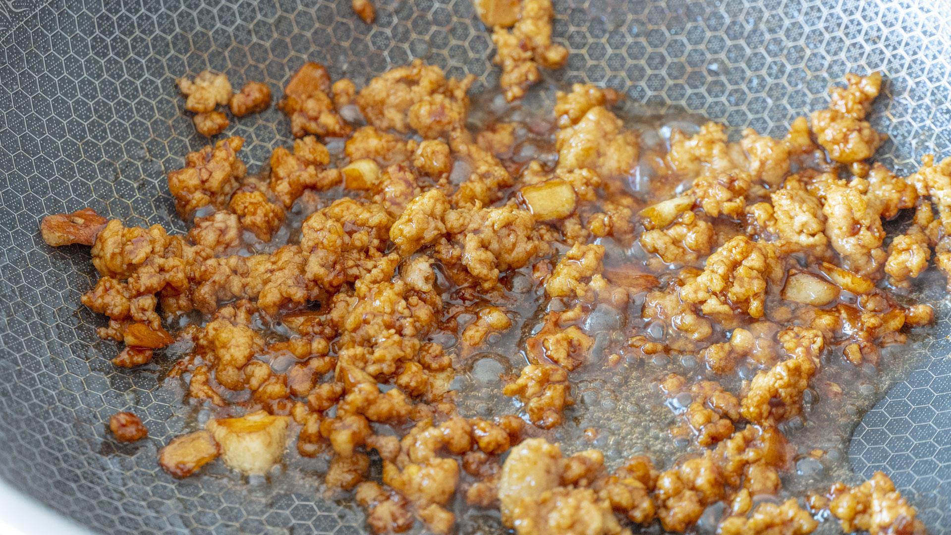 3、鍋中倒少許油,將蔥薑蒜末炒香,倒入牛肉糜炒至變色,淋上調好的料汁煮至濃稠盛出備用。