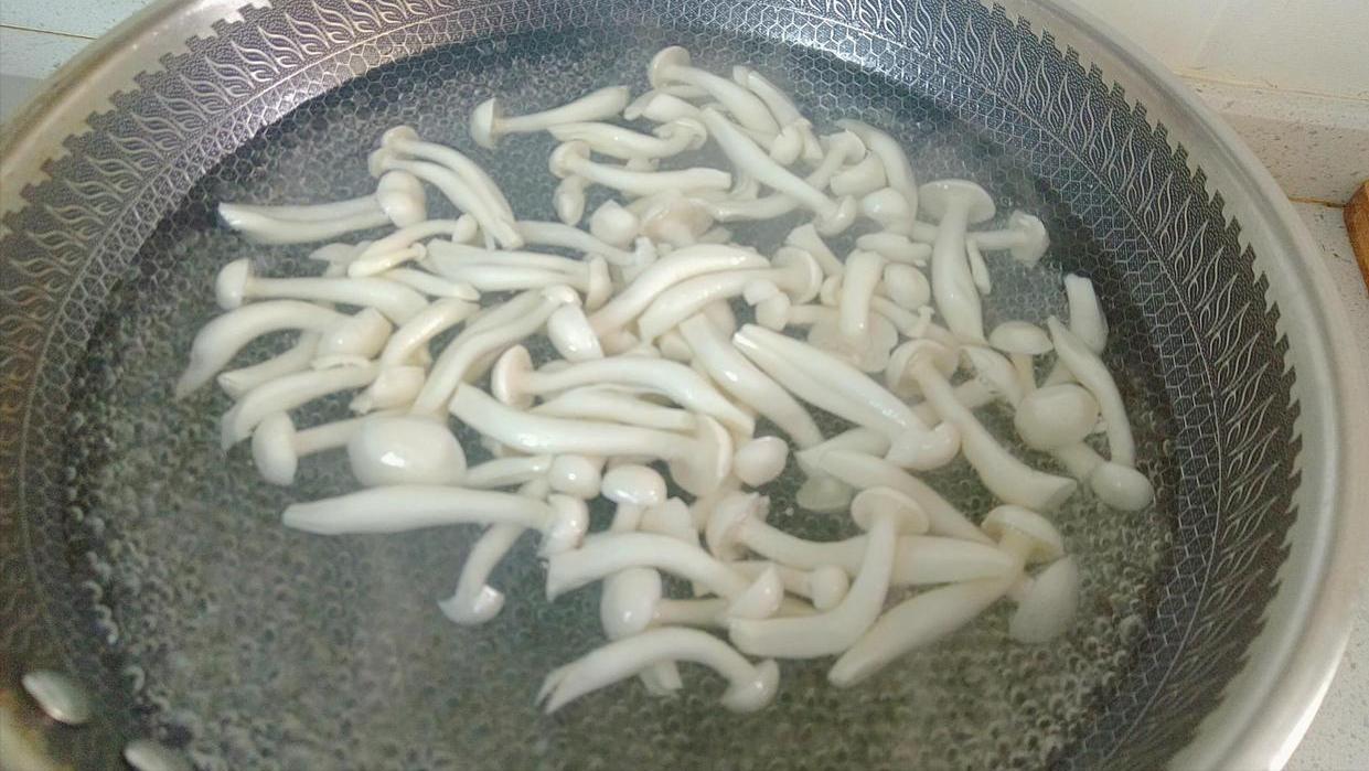 3、白玉菇1盒去根洗淨,水開下白玉菇焯水,中火煮5分鐘。