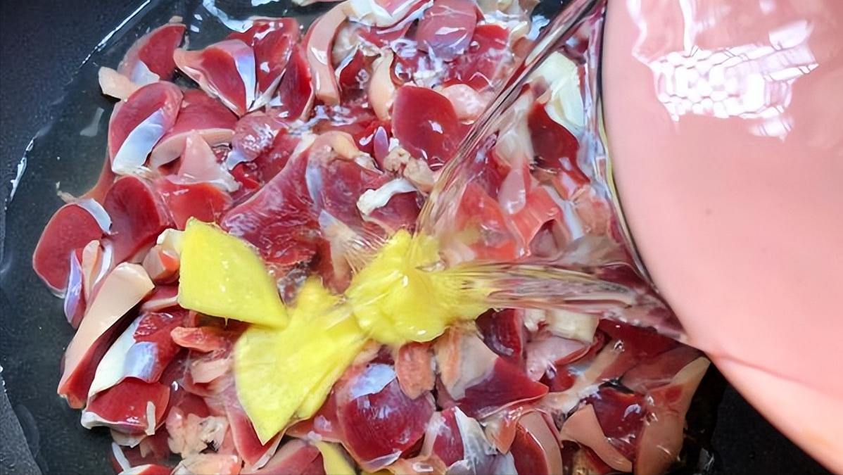 3、鍋裏燒水,水開以後放入雞胗焯燙,滴少許醋和料酒,再來點生薑和蔥去腥,雞胗焯變色用溫水衝去血沫。