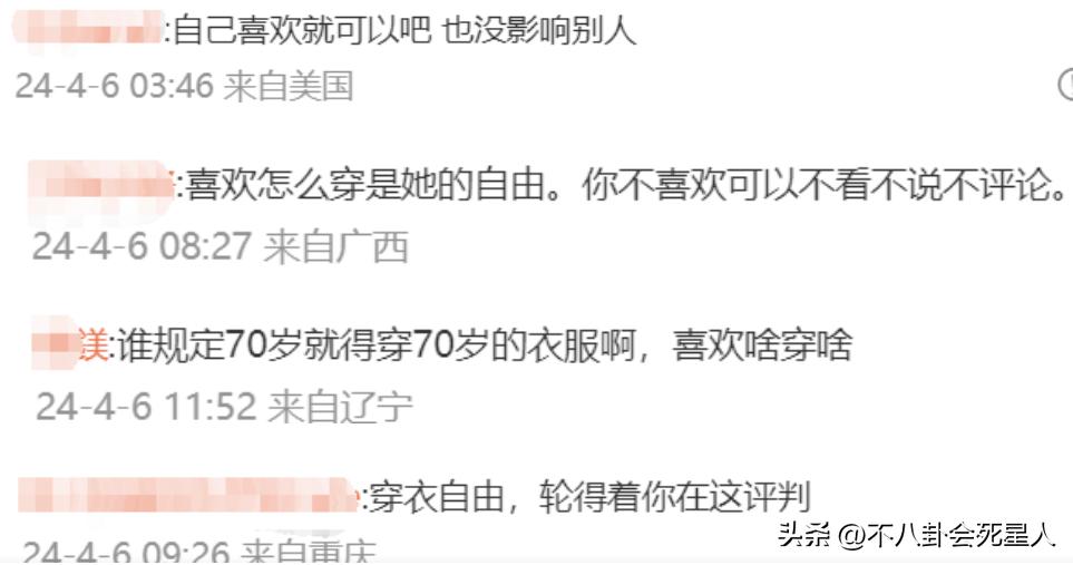 有網友“批判”趙雅芝的扮嫩,但也有網友覺得其實每個人都有“穿衣自由”,女明星也不例外,只要不是做違法的事情,她們爲什麼不能選擇穿自己喜歡的衣服呢?沒有任何人規定,70歲的人應該穿什麼衣服。