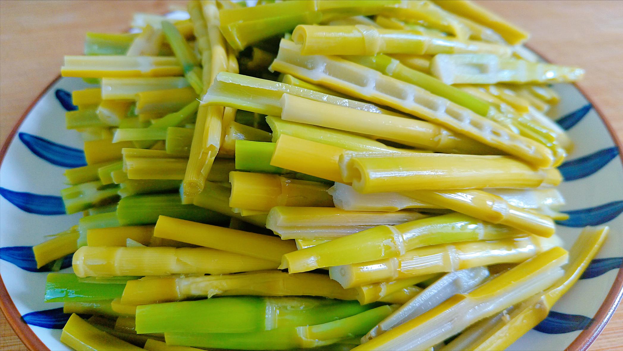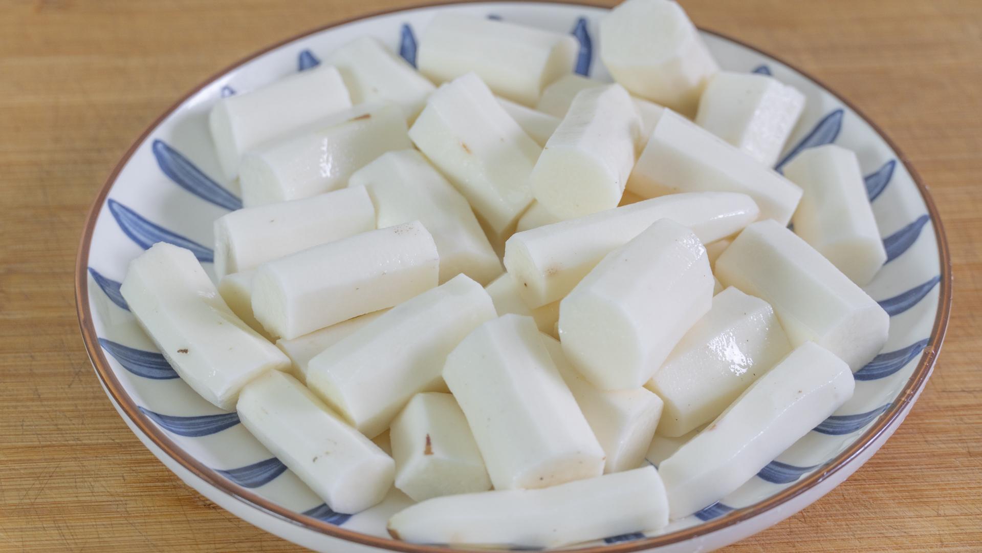 2、煮好後撈出來用涼水泡一泡降溫,再切成小長條,然後就可以放一盤備用了。