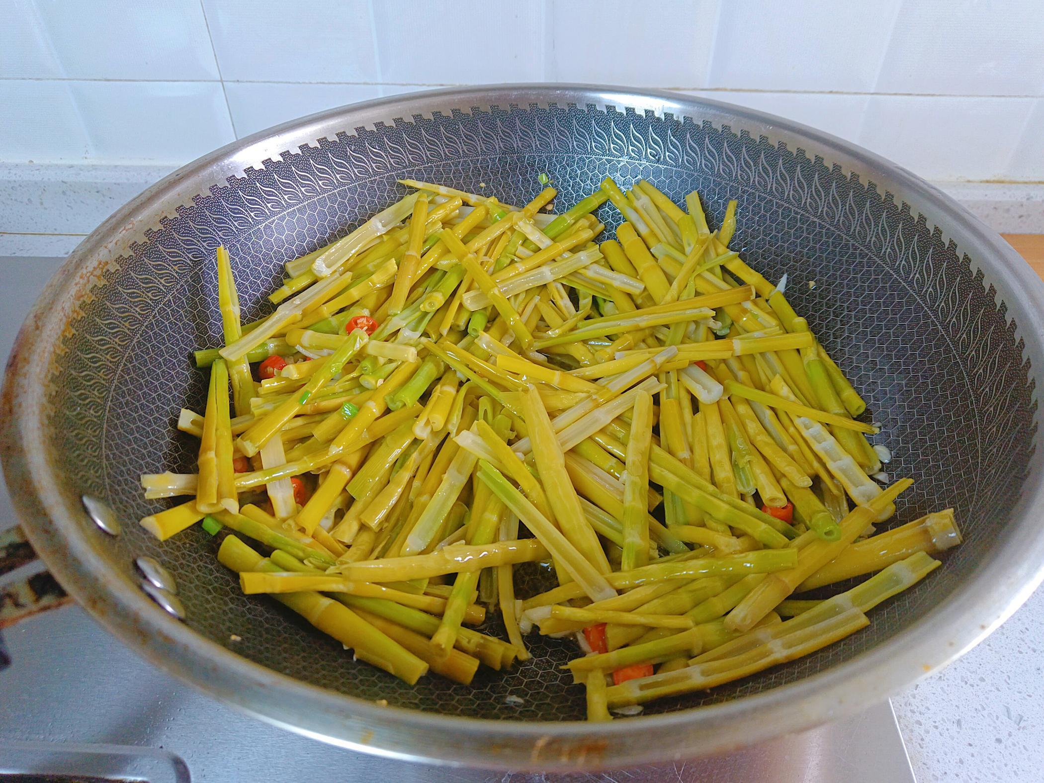4、起鍋熱油,下蔥蒜小米椒爆香,接着把竹筍倒進來炒。大火翻炒一分鐘後把韭菜也倒進來,調味加鹽、雞精、糖、生抽、蠔油,拌勻後就可以關火了。