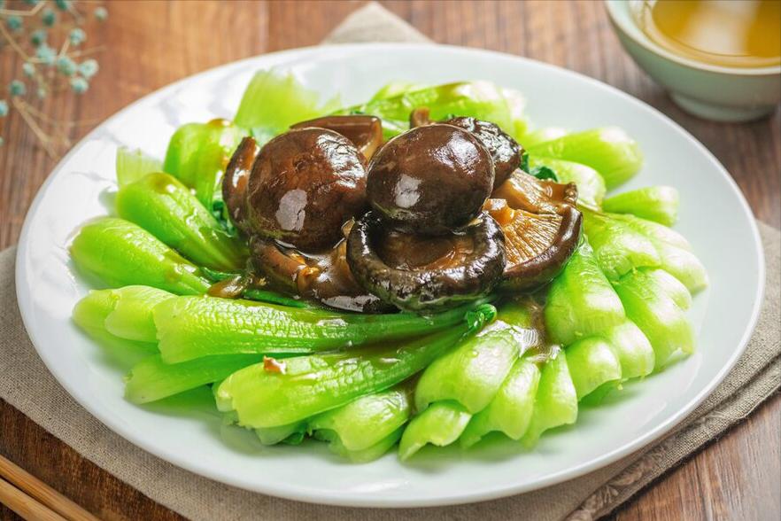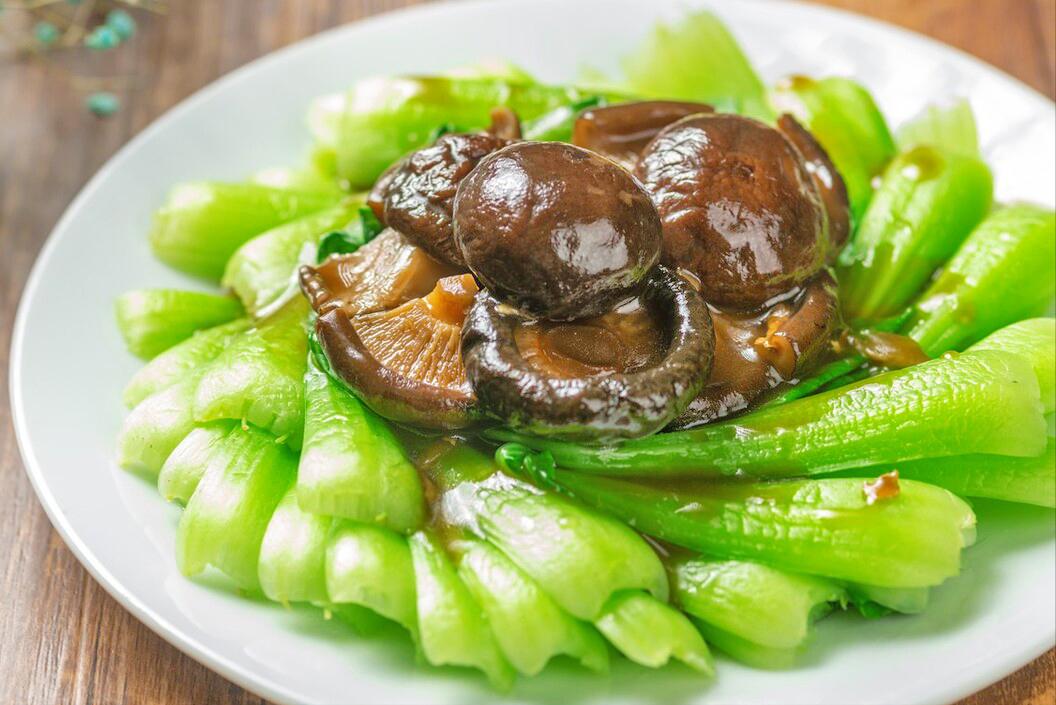 4、鍋中熱油,油熱加入蔥蒜醬油蠔油淋入半碗水,水熱加入香菇至香菇熟,然後將香菇撈出放在油菜中間;鍋中湯汁加入水澱粉轉小火不停地攪拌,待湯汁濃稠淋在香菇油菜上,一道爽口開胃的香菇油菜就做好了。