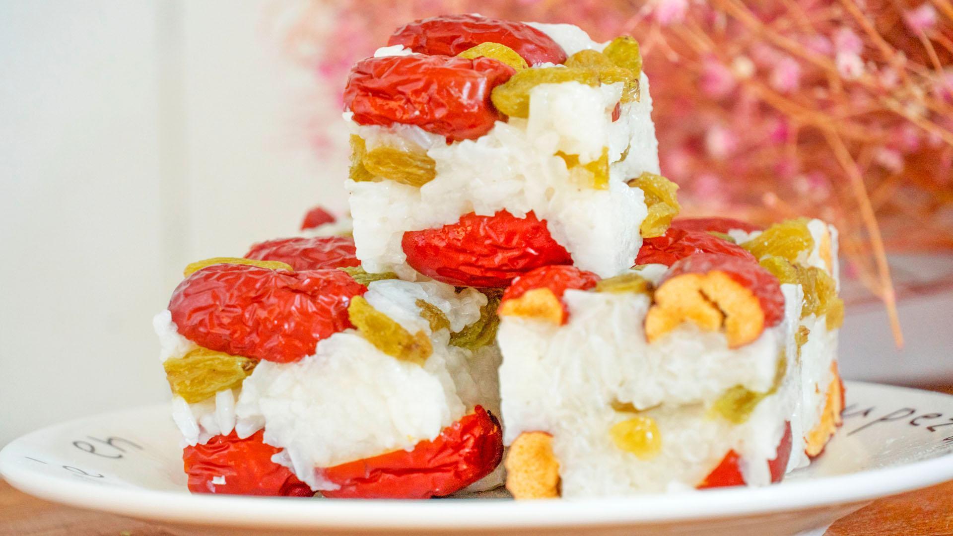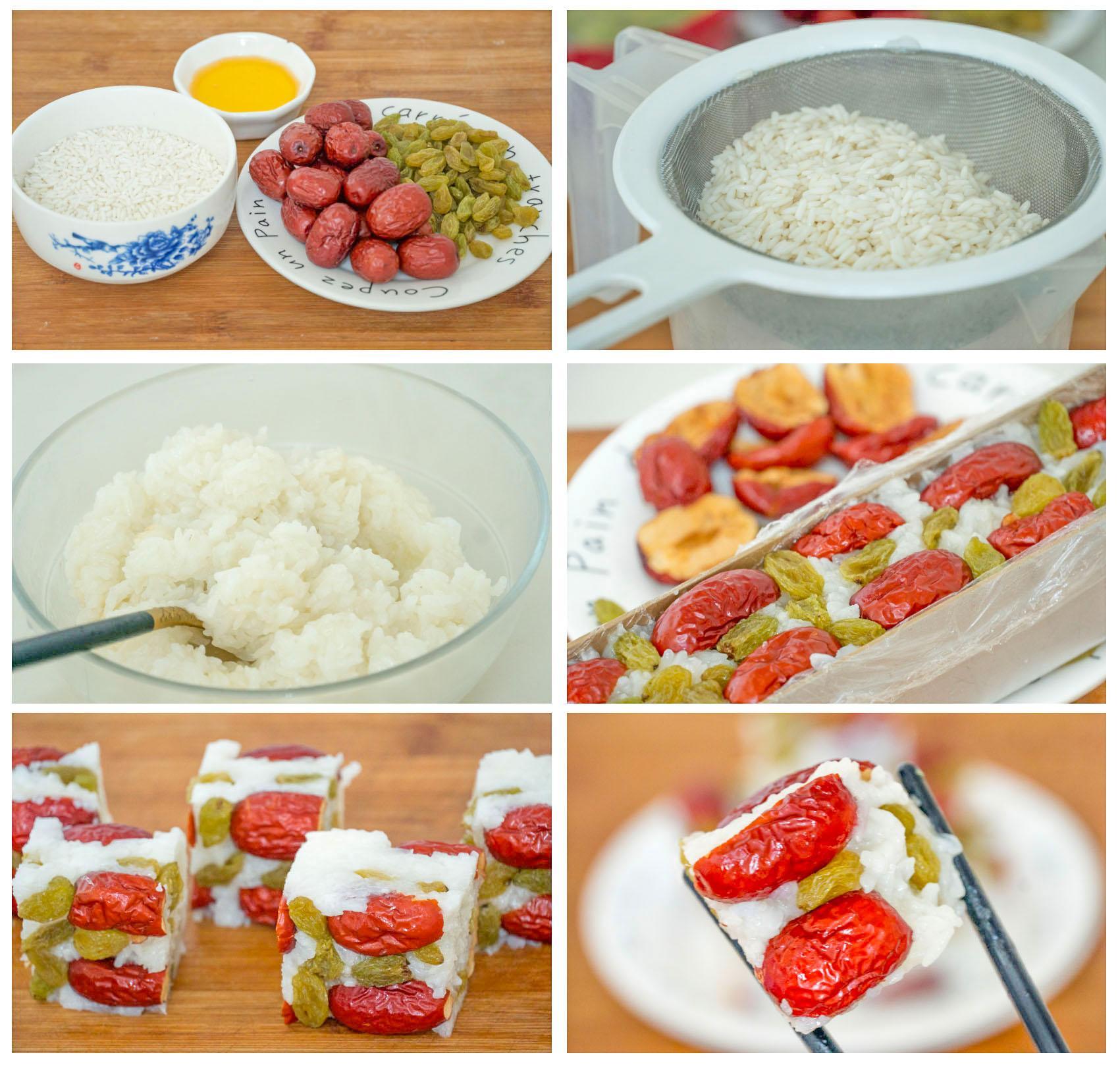 4、準備一個模具,底部鋪上一層保鮮膜 方便脫模,擺上紅棗,壓緊糯米飯,擺上葡萄乾,繼續鋪上糯米飯,要壓得緊實一些,最上面再擺上紅棗和葡萄乾。