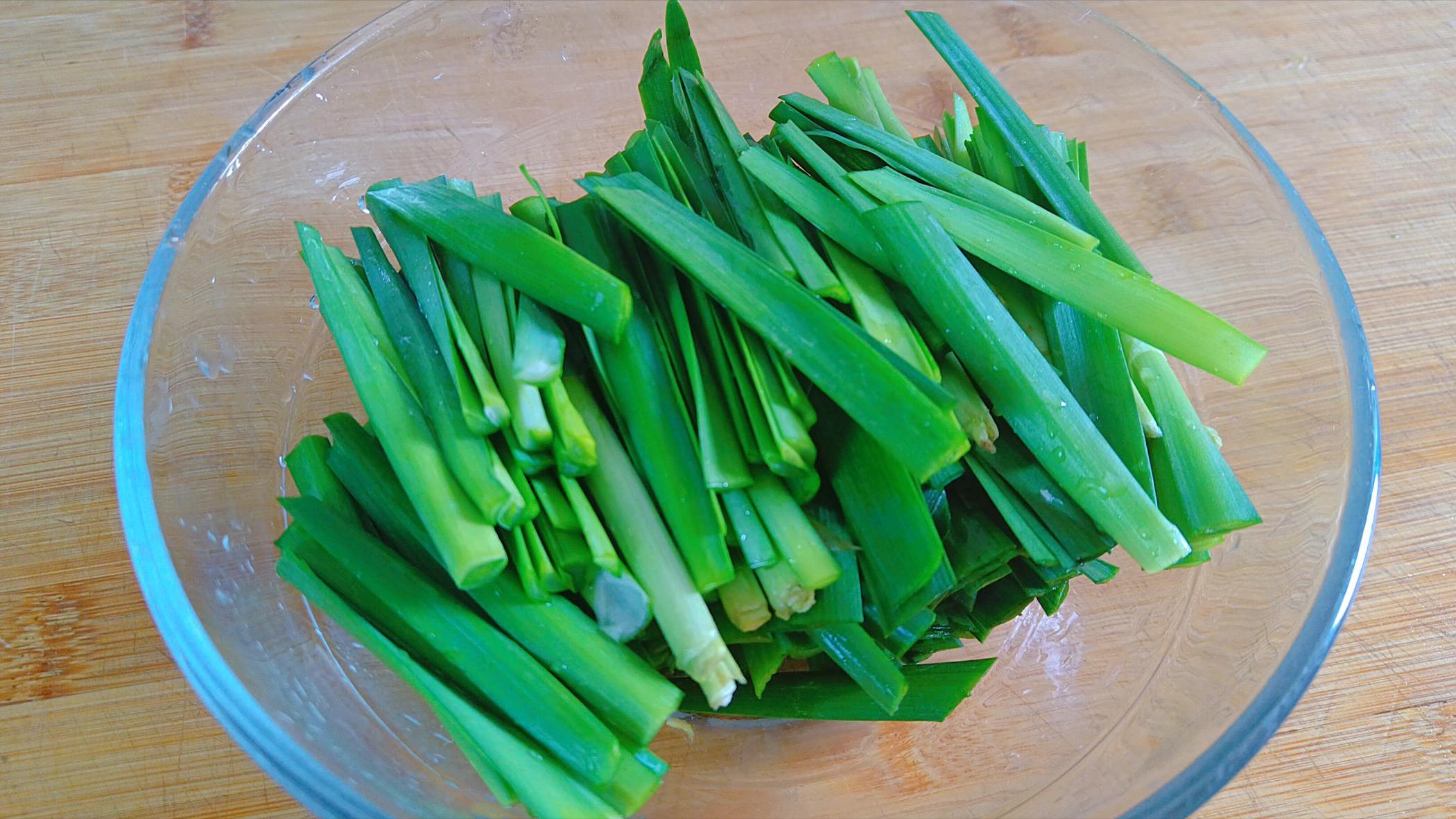 3、韭菜1把洗淨,晾乾水分切成小段兒。
