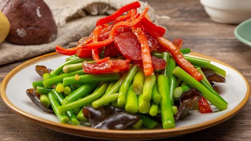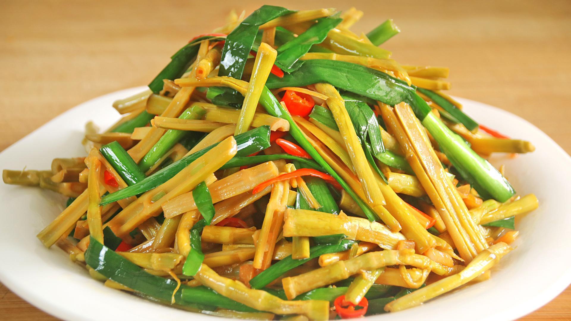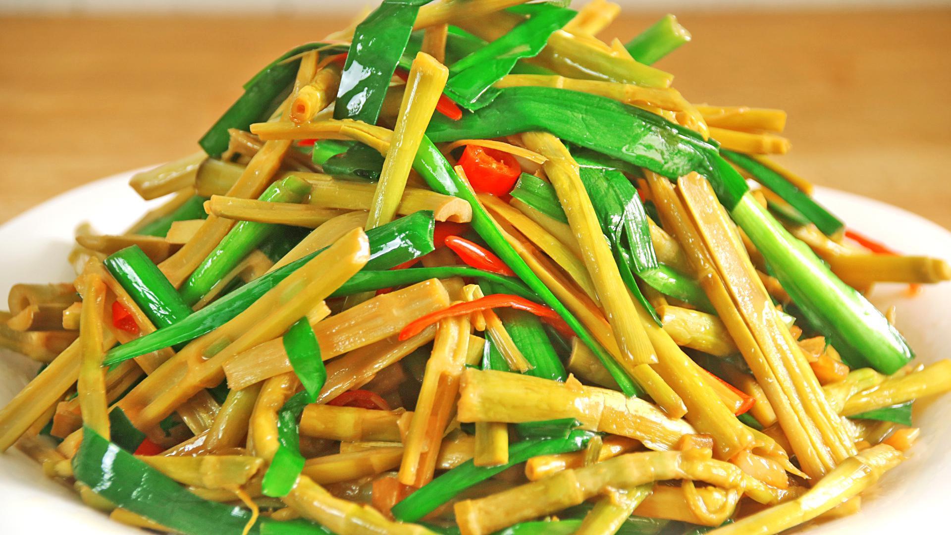 5、韭菜燙一下就能熟,所以最好放,而且炒的時間也要儘可能的短,最好是不超過1分鐘。出鍋後裝盤就可以開喫的。好喫的韭菜炒春筍就做好了。