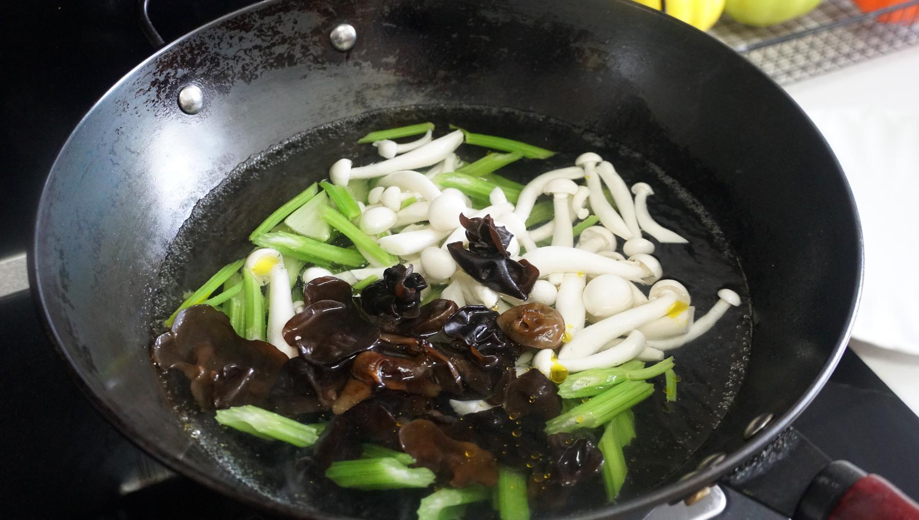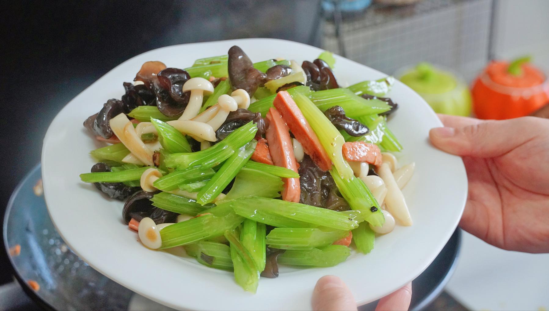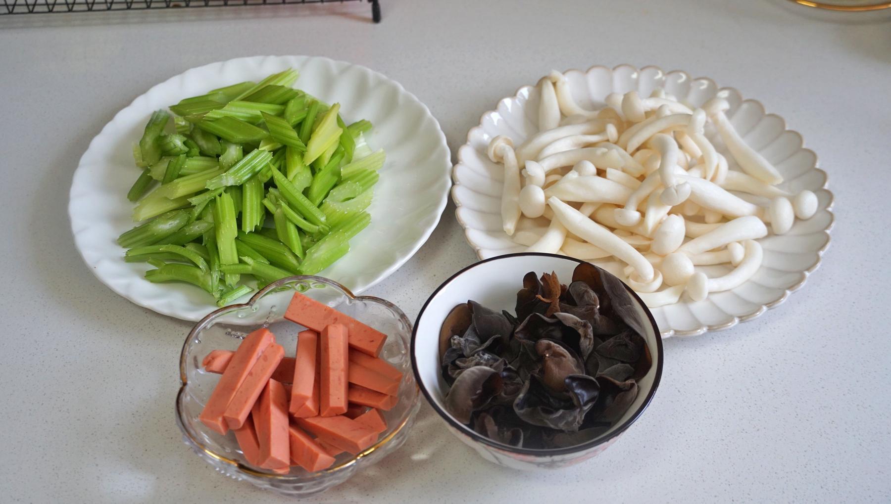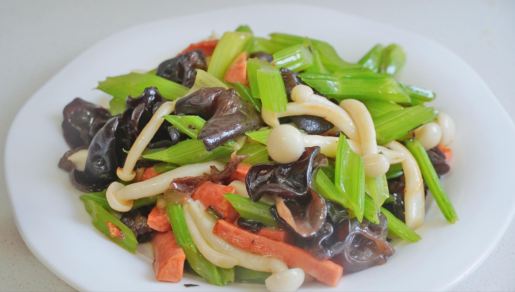 1、芹菜炒白玉菇我還配了一點木耳和火腿,這個菜炒出來就是很清爽的,我一般都會焯下水了再炒;