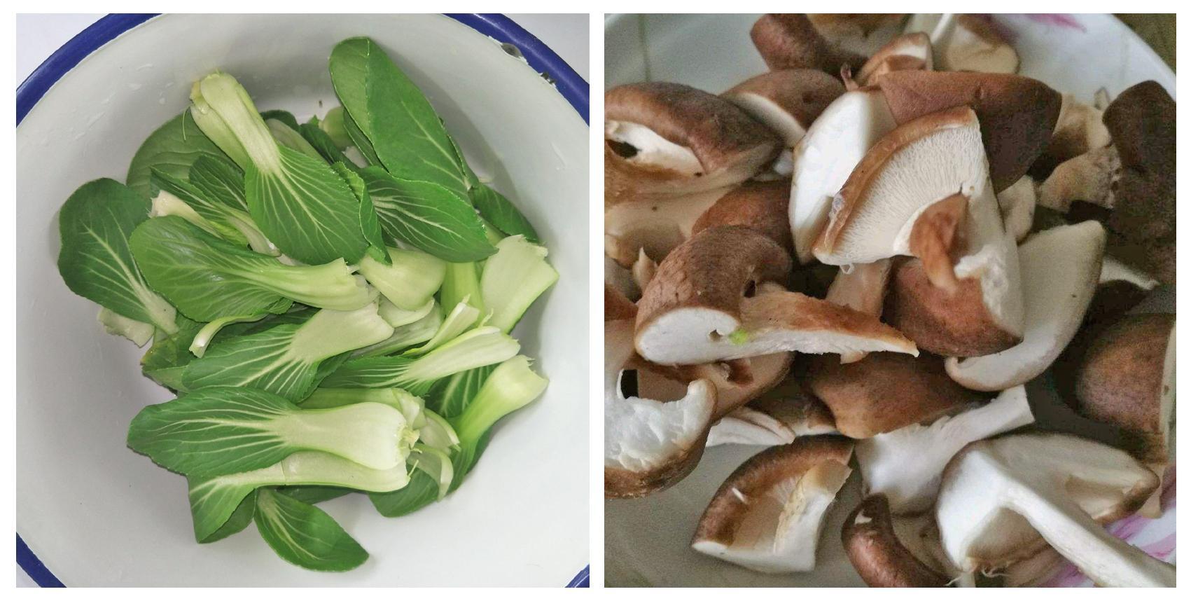 2、香菇柄單獨切下來,大菇傘一切 3 瓣,小菇傘一切 2 瓣,油菜葉子一次掰下來;