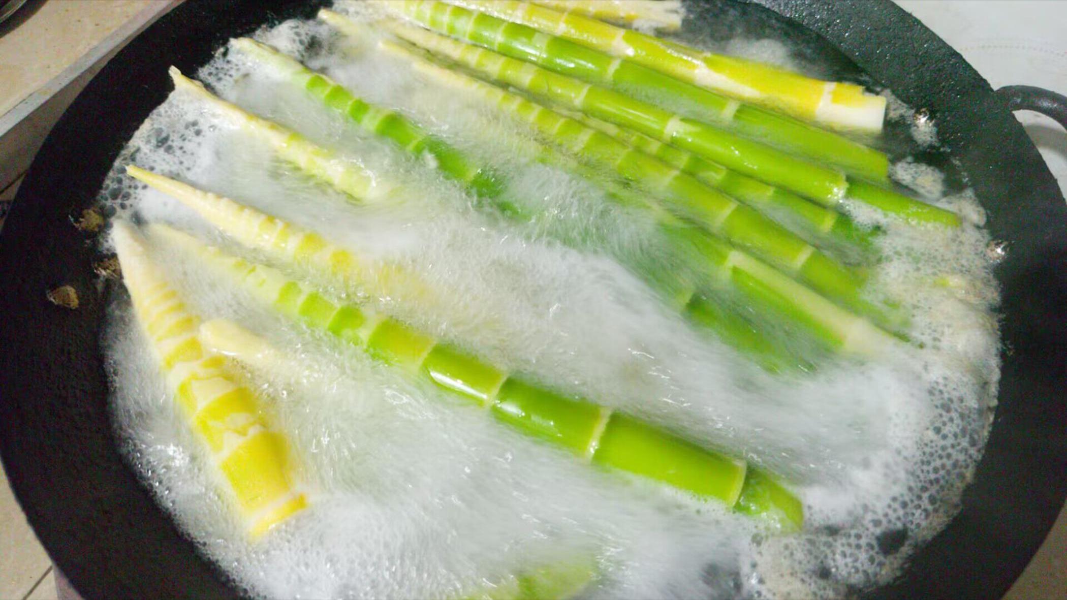 1、新鮮的春筍剝皮後削去老的根部。起鍋燒水,水開加一勺鹽,下入竹筍焯水,大火煮6-8分鐘,將竹筍煮一下,不僅可以去掉它的澀味,還更方便我們保存。