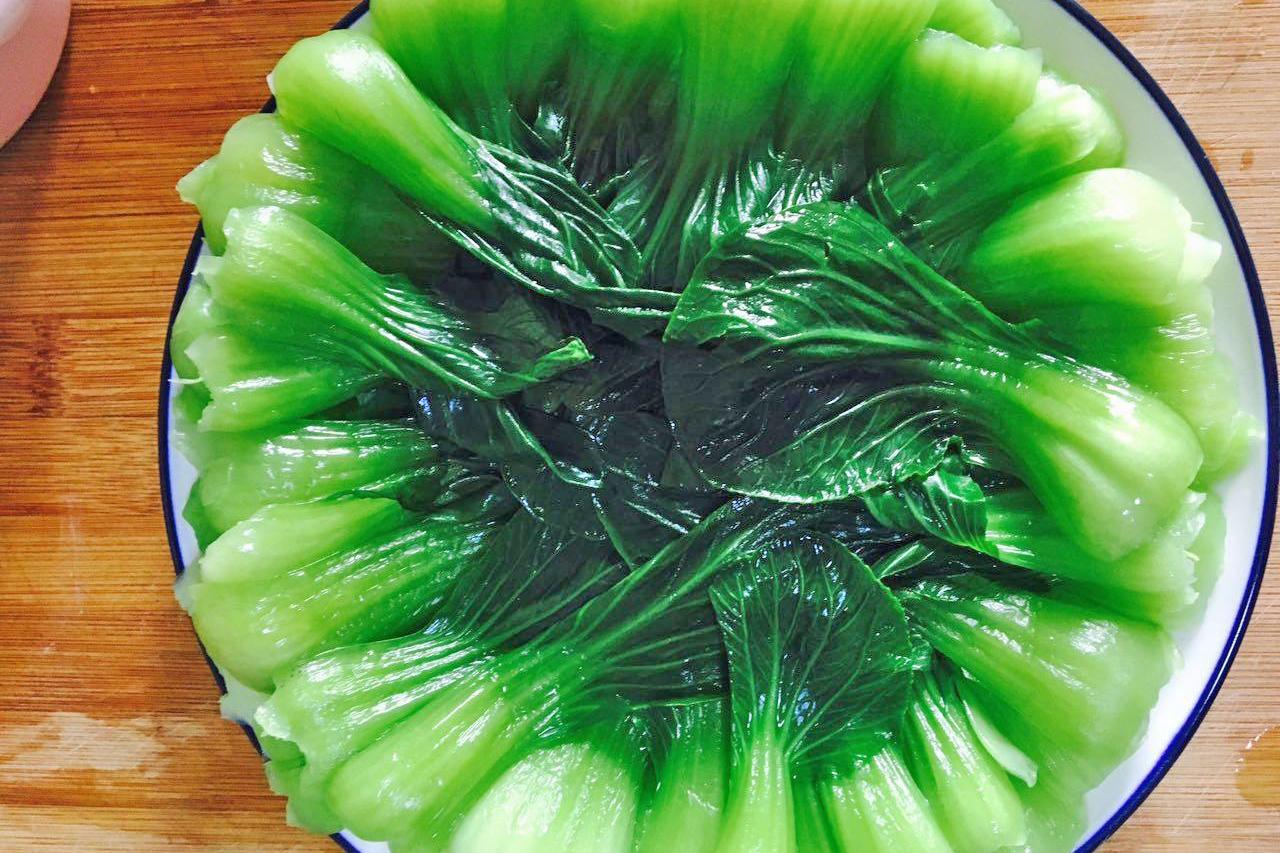 3、鍋中燒水,水熱加入一小勺鹽和幾滴油,再加入油菜焯熟,沖涼水可保持顏色翠綠,口感清脆,然後瀝乾擺成花型;