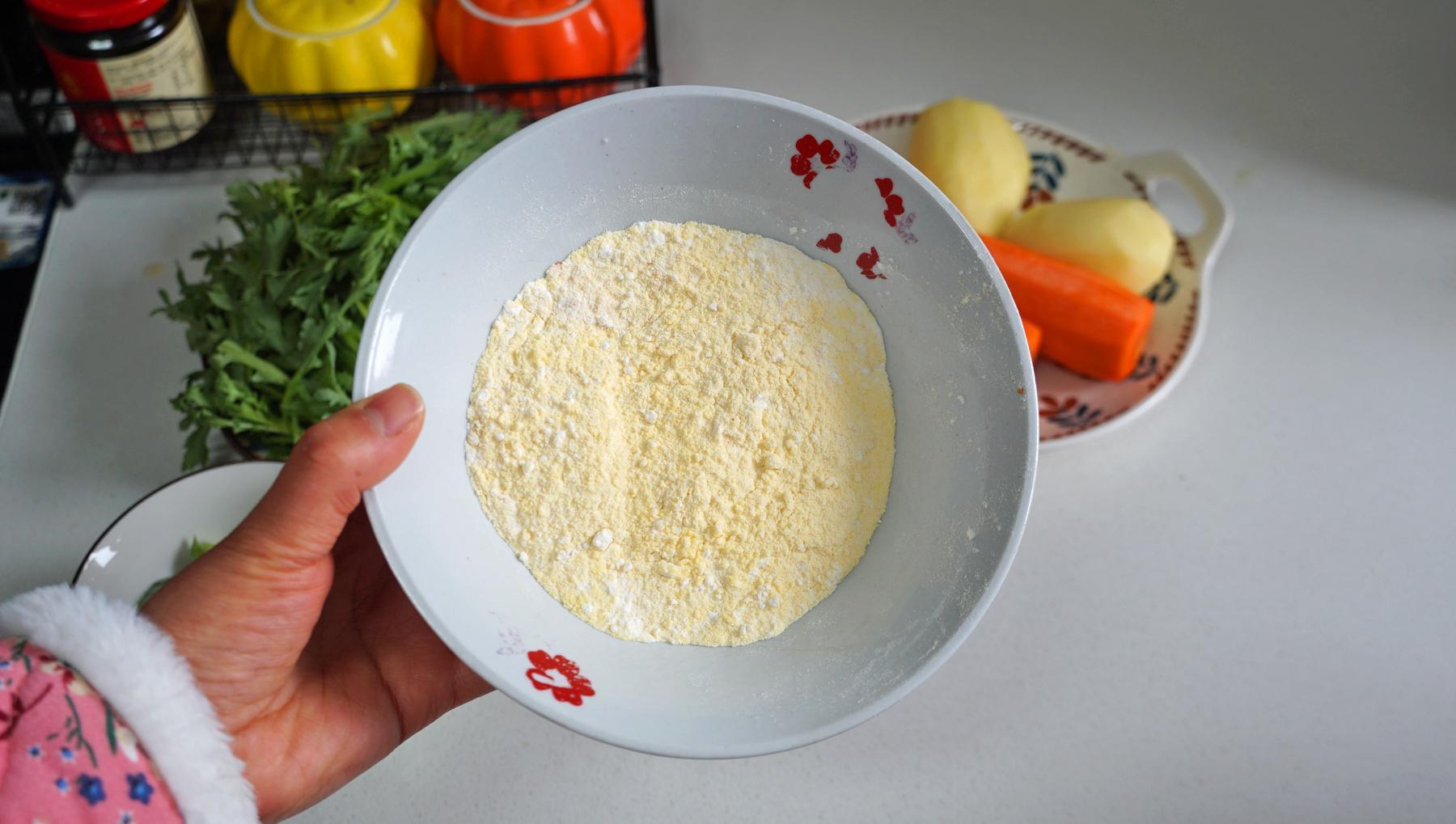 1、蒸茼蒿方法也非常簡單,兩勺玉米麪搭配了一勺麪粉,再加一點點鹽和十三香,攪拌攪拌;
