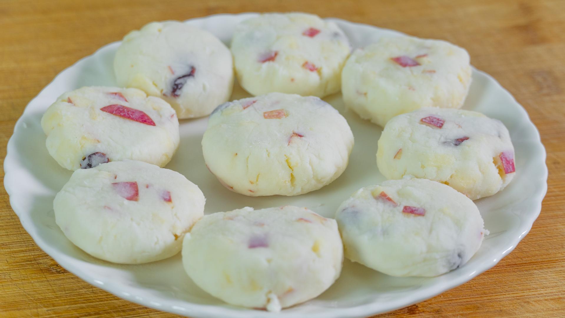 4、山藥蒸熟後取出來,倒入大碗裏後加20克白糖壓成細膩的山藥泥。把蘋果丁倒進來,再加一把蔓越莓幹,抓拌均勻後揉成一個團。