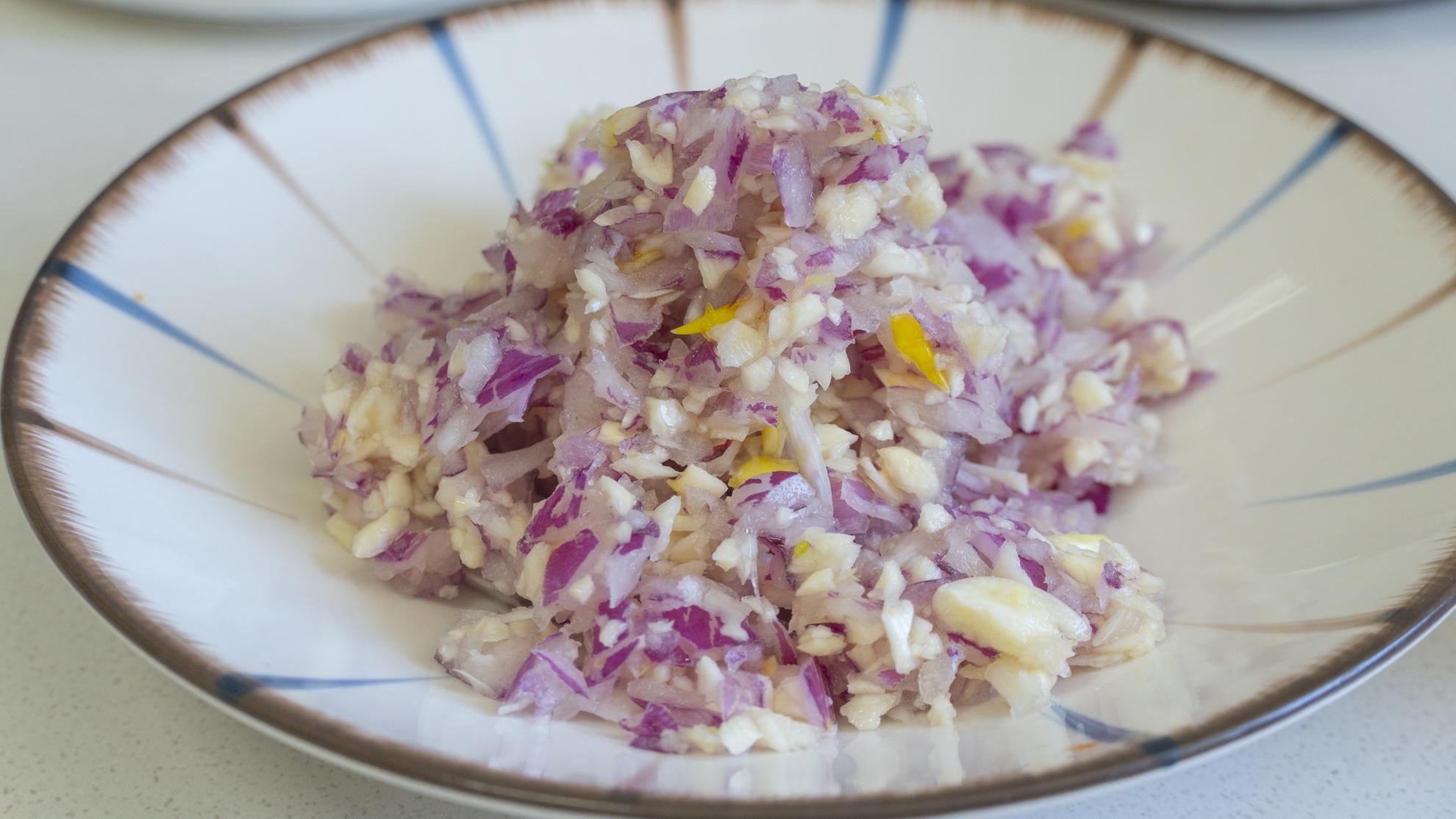 1、洋蔥就稍微的切一下,然後和大蒜一起打碎。