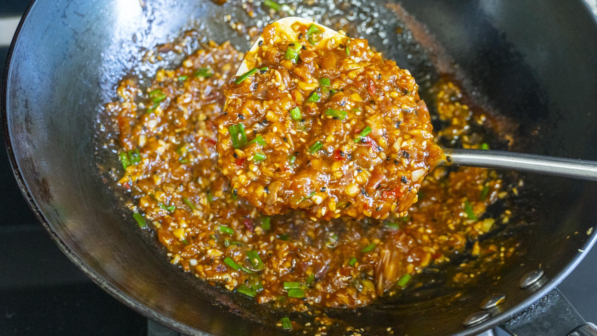 3、鍋裏來熱油,先把洋蔥和蒜末倒進來炒,把它們炒香,然後再把醬汁倒進來,給它咕嘟咕嘟煮一下,儘量熬的濃郁一點,出鍋前撒點蔥花和黑白芝麻。
