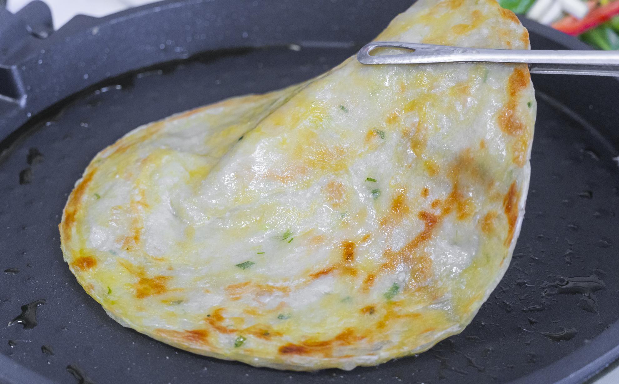 4、麪餅我今天用的就是手抓餅,用電餅鐺煎一下就行,刷點油幾分鐘就好了。很簡單的也很酥脆,煎到兩面焦焦的就可以出鍋了。