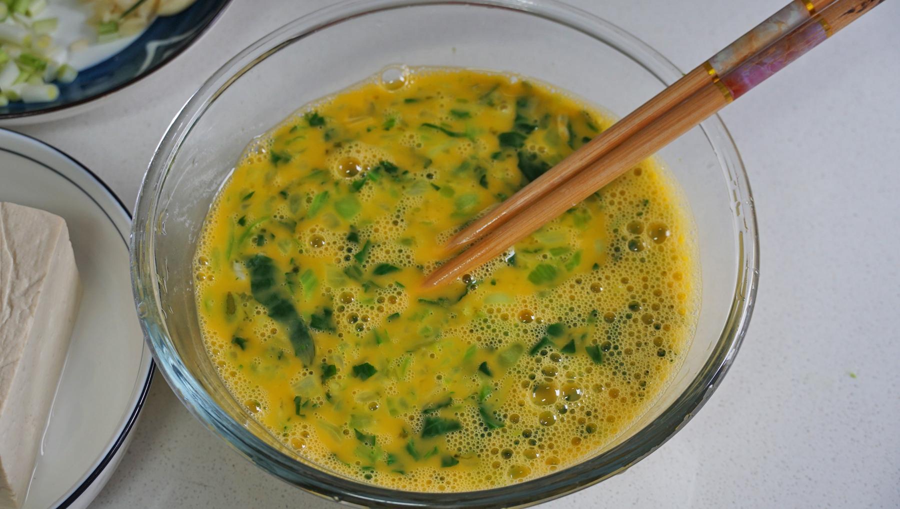 2、再來打雞蛋,5個雞蛋、一勺鹽、一點料酒,再加一點點澱粉水,給它先攪散,再加150克的溫水,蔬菜也倒進來,拌一拌;