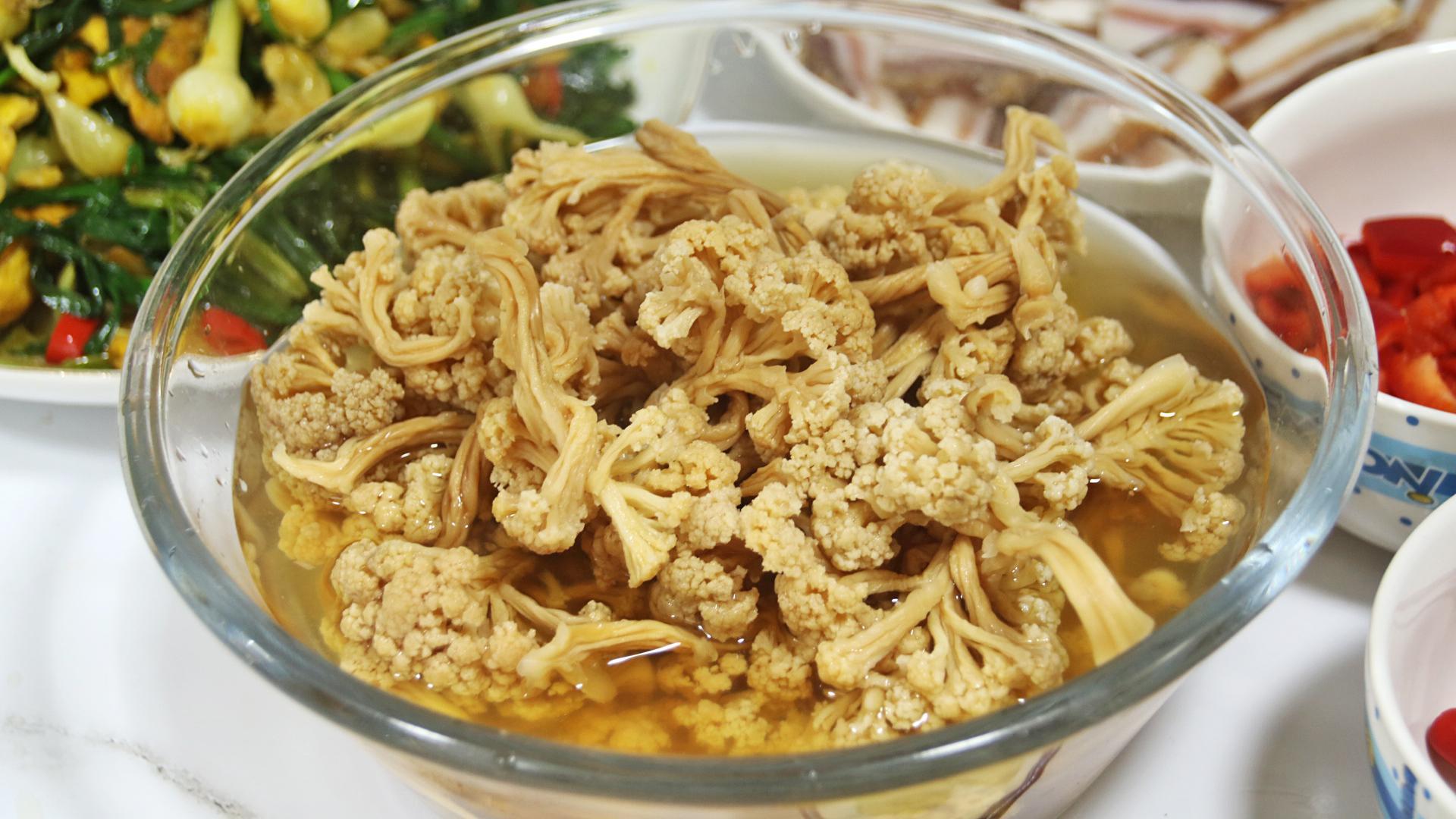 1、我還炒一個去年曬的花菜乾,提前用溫水已經泡了40分鐘了;