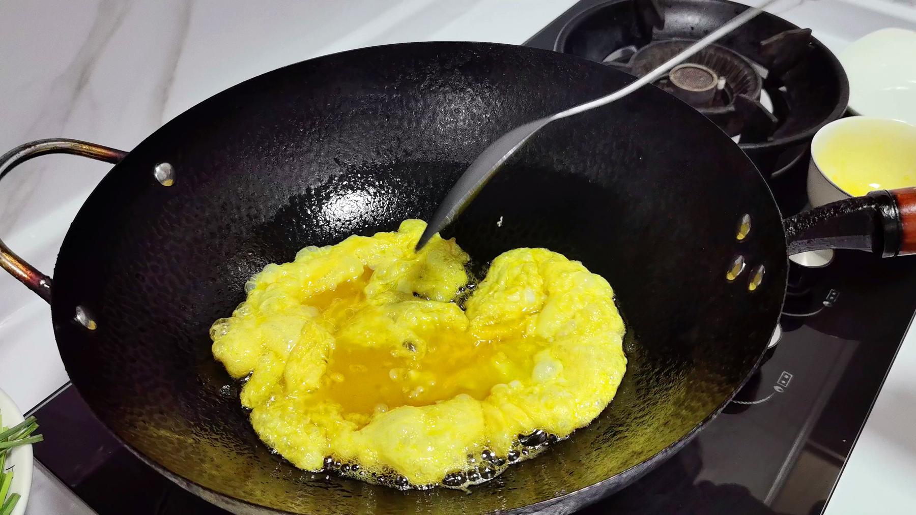 4、鍋中油熱了倒入蛋液煎至定型,滑散炒成這種大一點的雞蛋塊就可以;