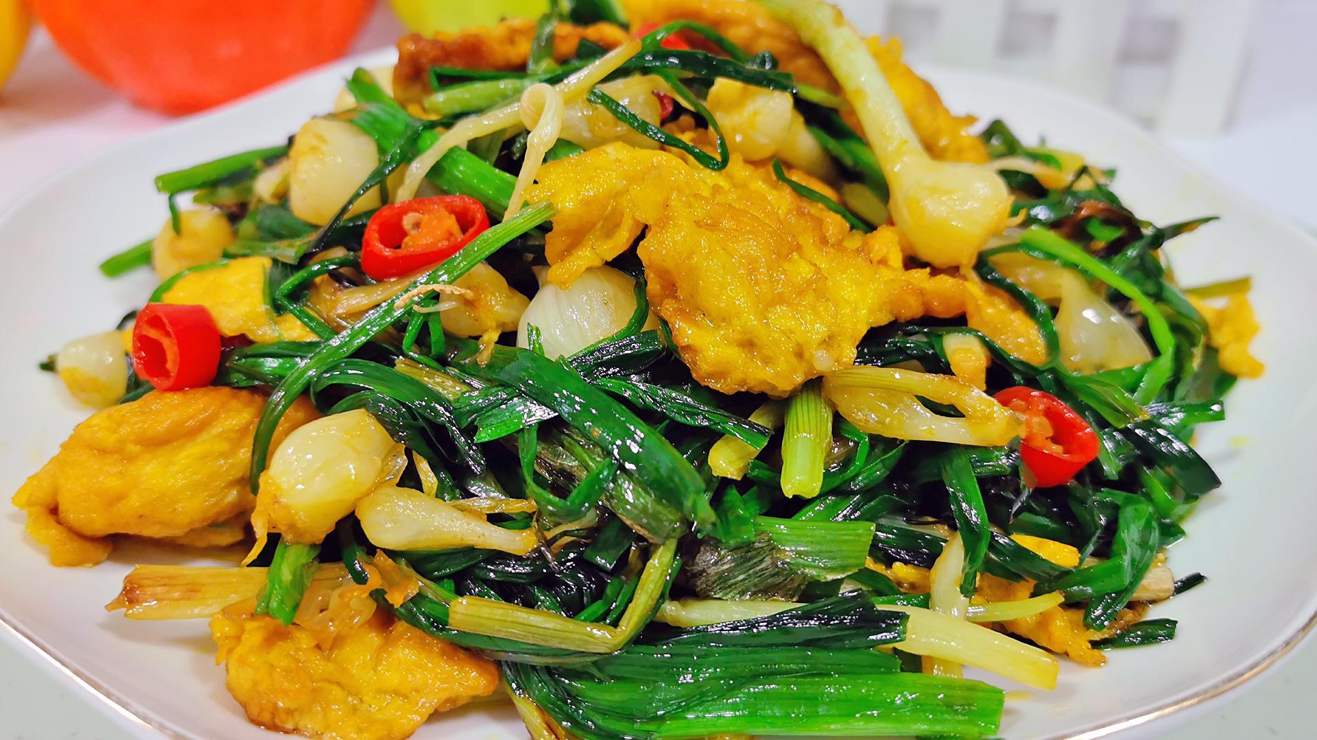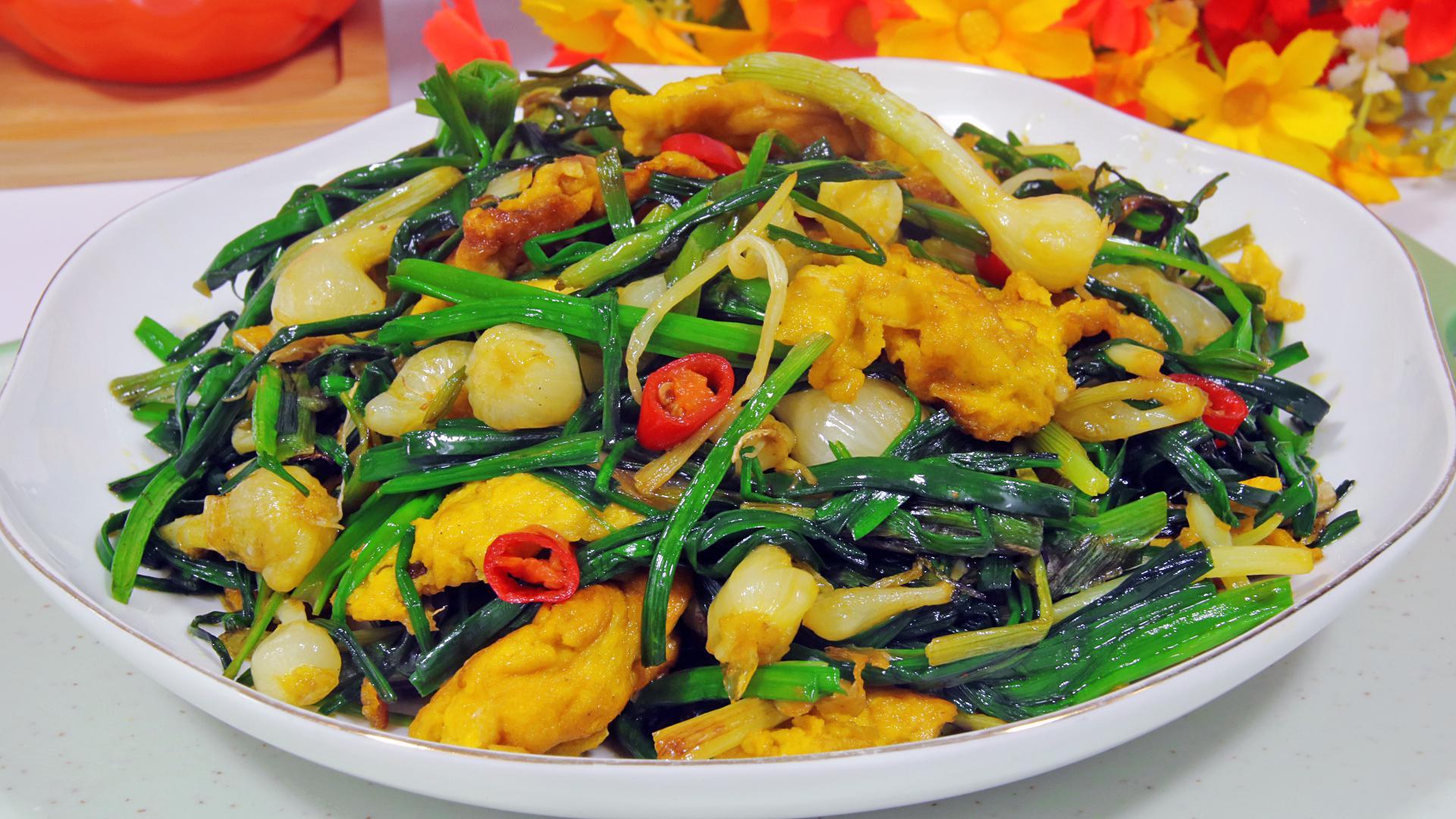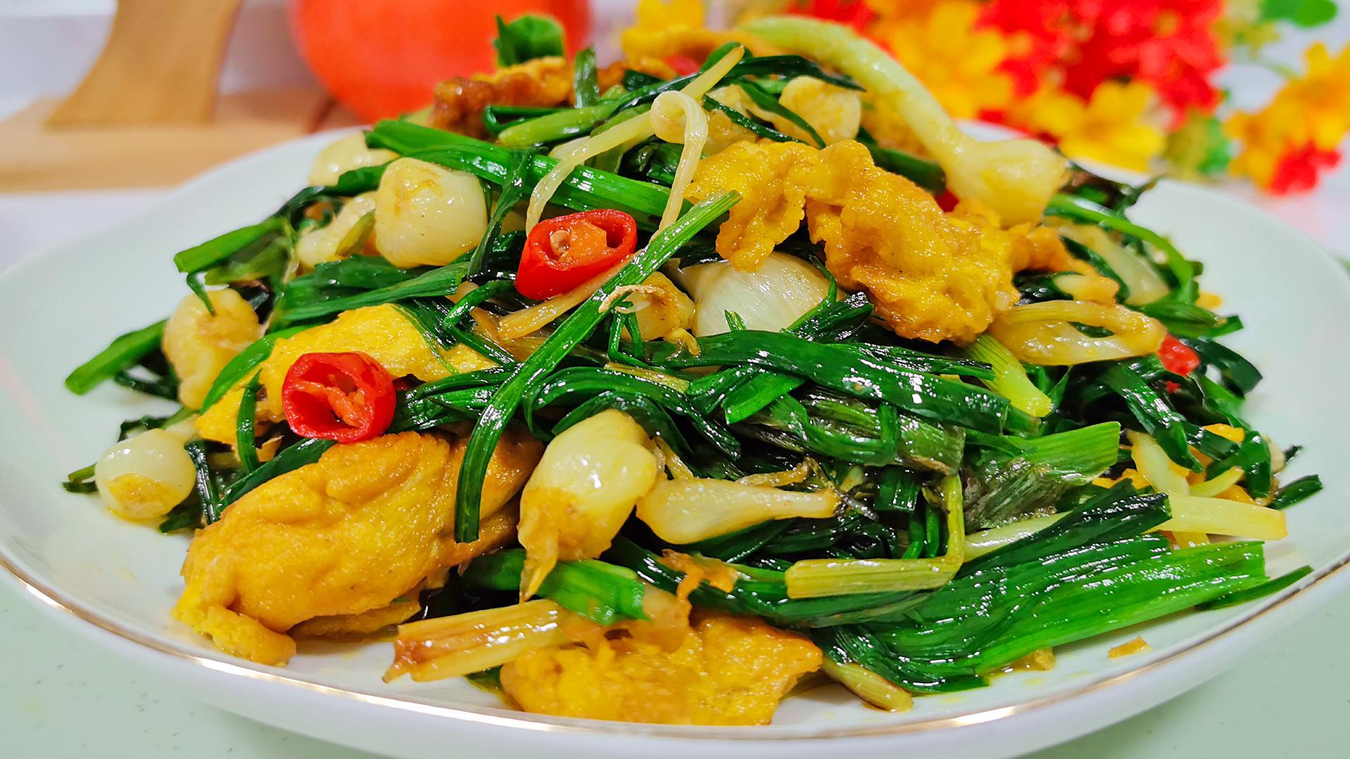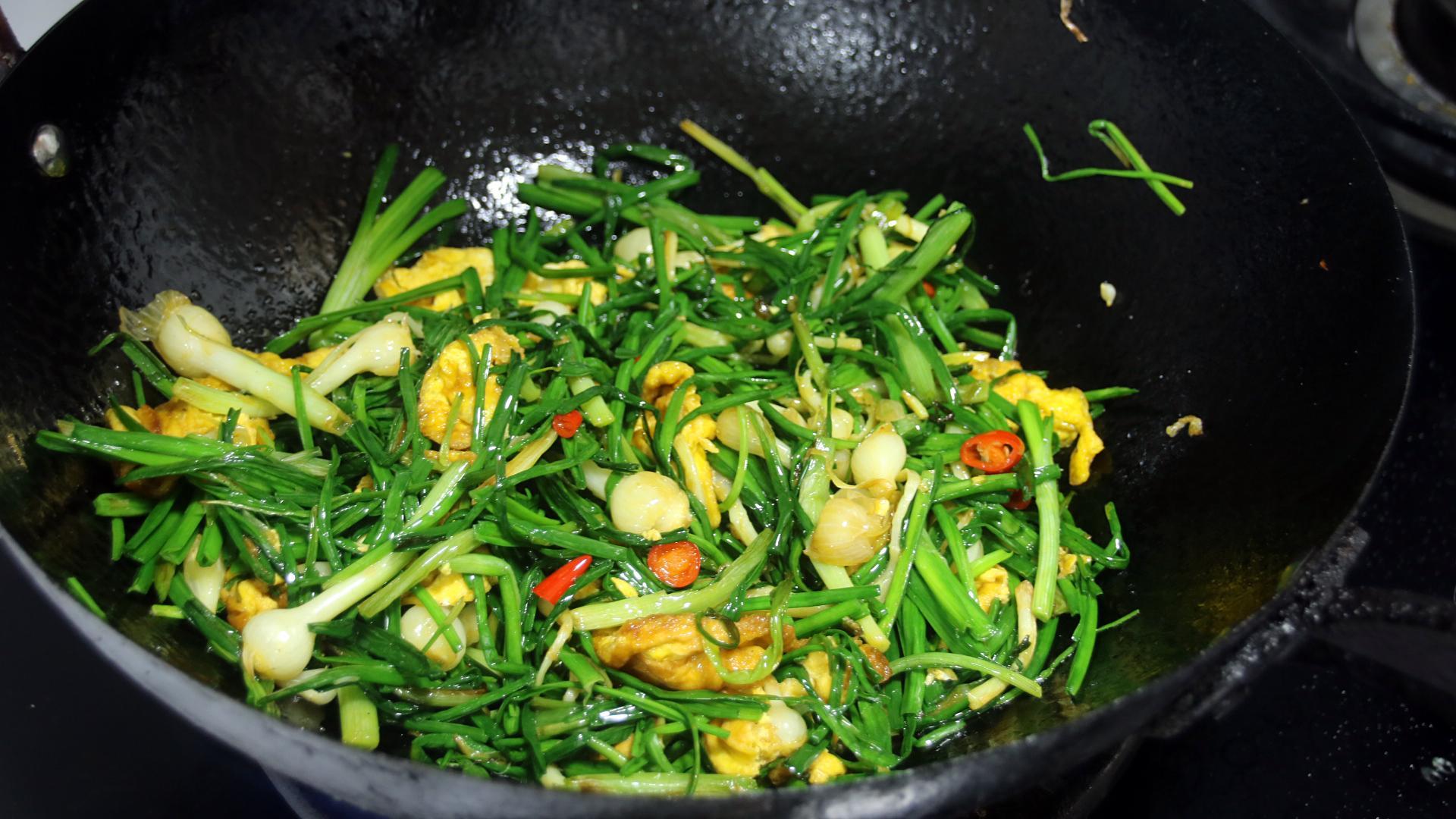 5、另起鍋下入切好的韭菜頭,小米辣、一點點鹽炒至斷生,再放入炒好的雞蛋,蠔油、味極鮮、花椒油,炒至入味;