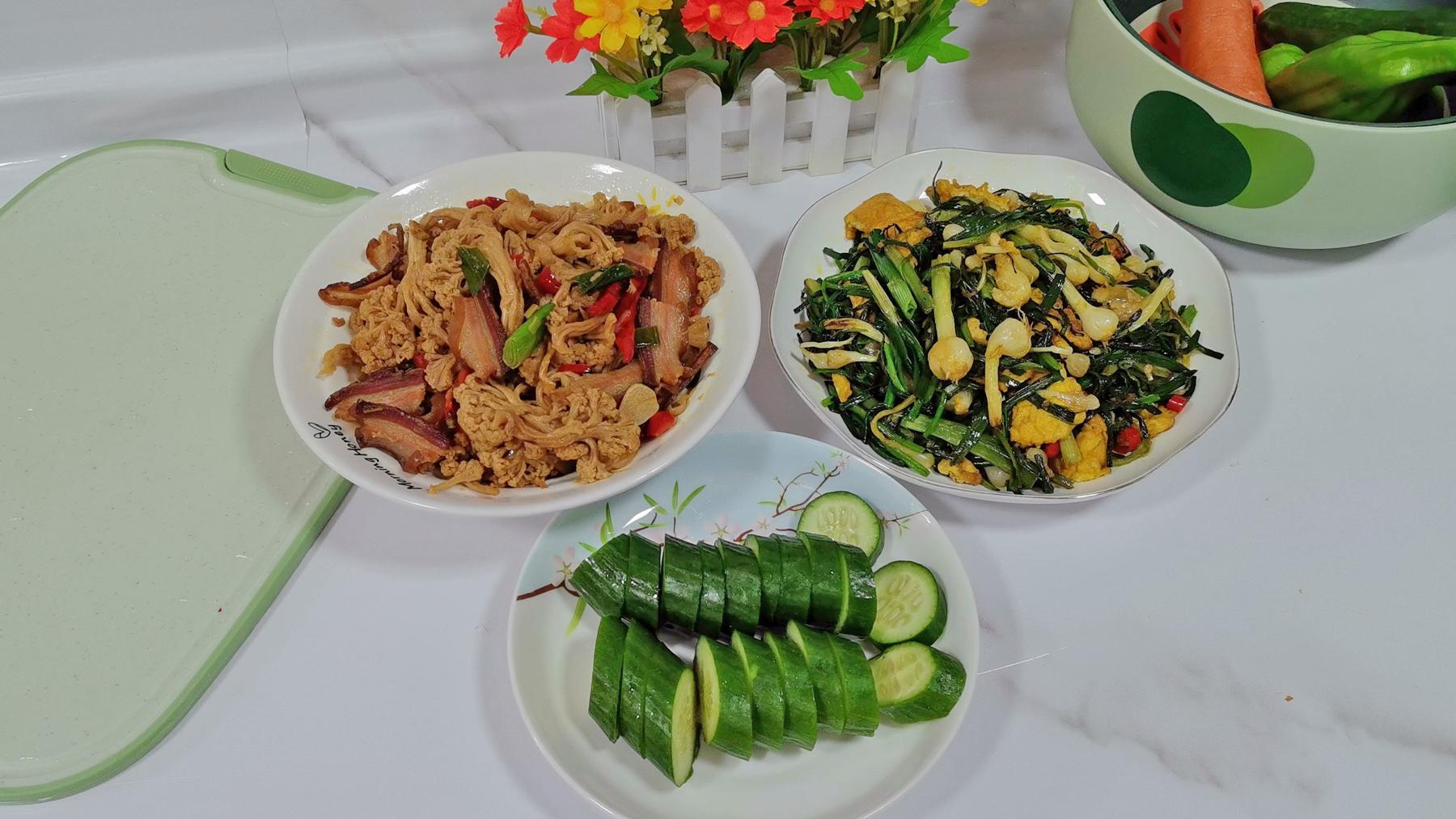 這是前兩天買的水果黃瓜,切一切,待會兒當做飯後水果吧;野韭菜的香味太濃郁了,我要去喫飯啦,明天見!