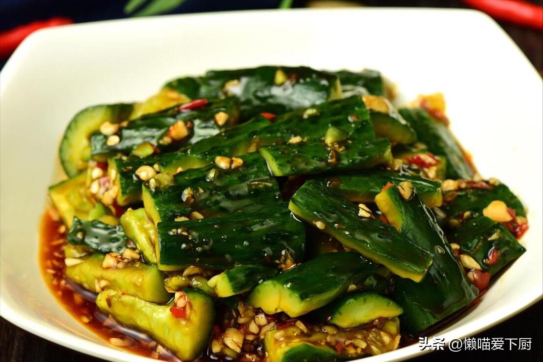 拍黃瓜:這道菜不需要太多介紹,應該是大家從小喫到大的,先將黃瓜拍扁,再加調料拌勻,喫起來清爽可口,不過川菜裏的拍黃瓜,辣椒紅油一定少不了。