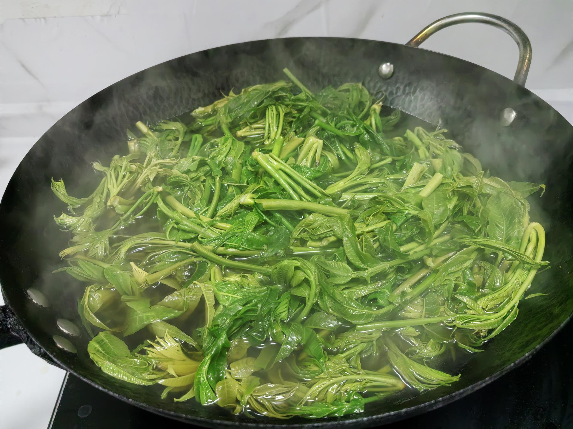3、水燒開之後滴幾滴食用油,倒入香椿,來回翻動焯燙1分鐘左右;