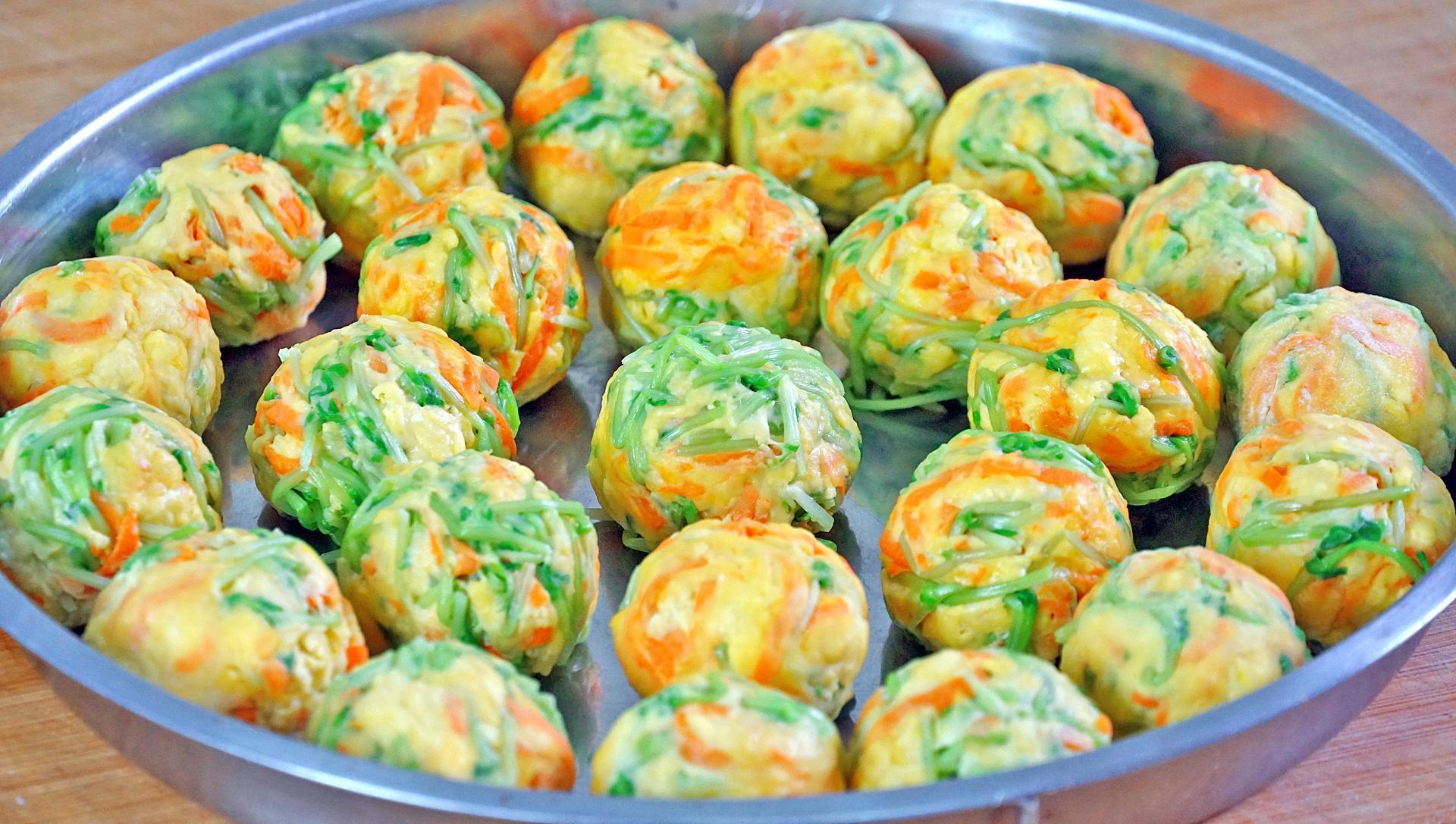 食材:豌豆芽、雞蛋、胡蘿蔔、大蒜、小米椒、蔥花
